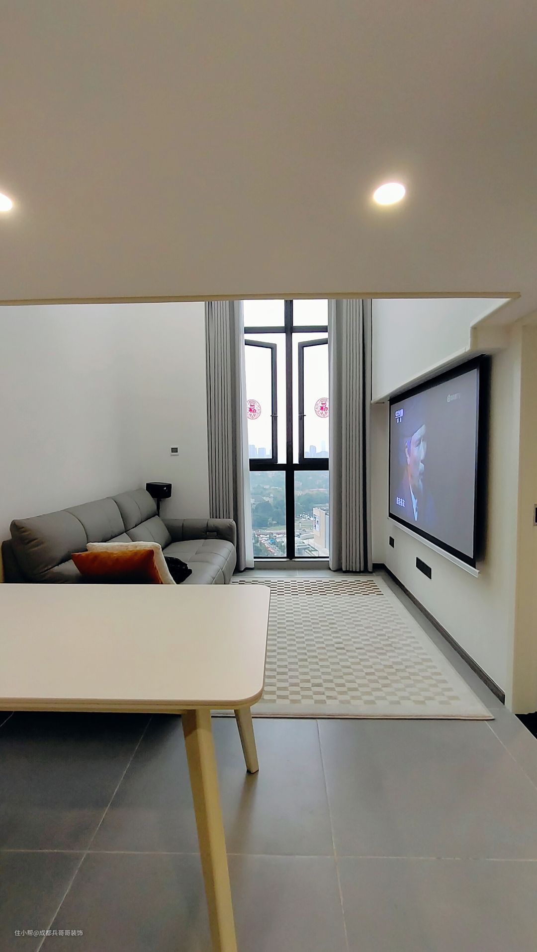 客厅,挑空设计,墙面简单涂刷白色乳胶漆,摆放两米多皮质沙发+投影仪幕布,提前预留了幕布盒子,白天看电视的效果也不错,纵享家庭影院。