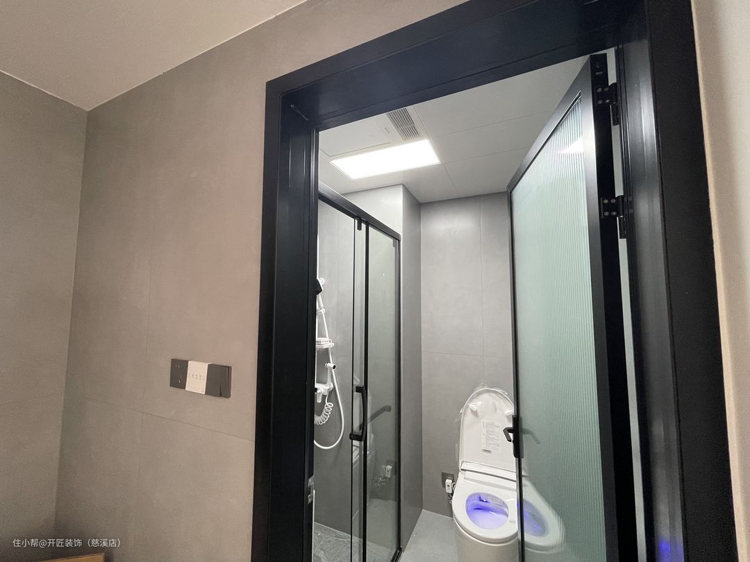 主卫忘了拍了,客卫做的是干湿分区,配的是智能马桶;黑色的玻璃门放在暖色系的房子里面,就是装饰