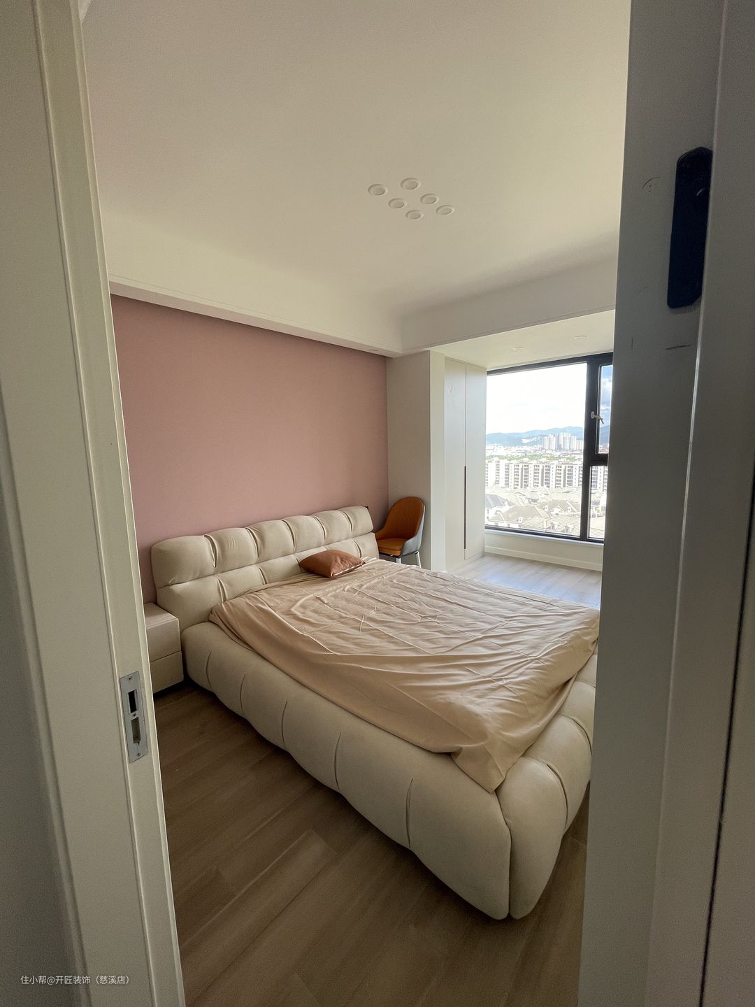 嗯,从房门看进去,一眼就知道是女儿房,粉色的背景,有写字桌、书柜;阳台同样纳入了房间,衣柜设置在阳台的两侧