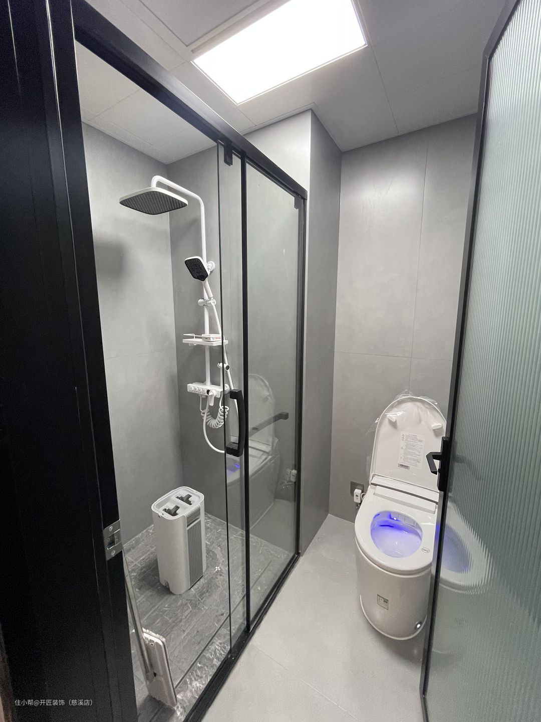 主卫忘了拍了,客卫做的是干湿分区,配的是智能马桶;黑色的玻璃门放在暖色系的房子里面,就是装饰