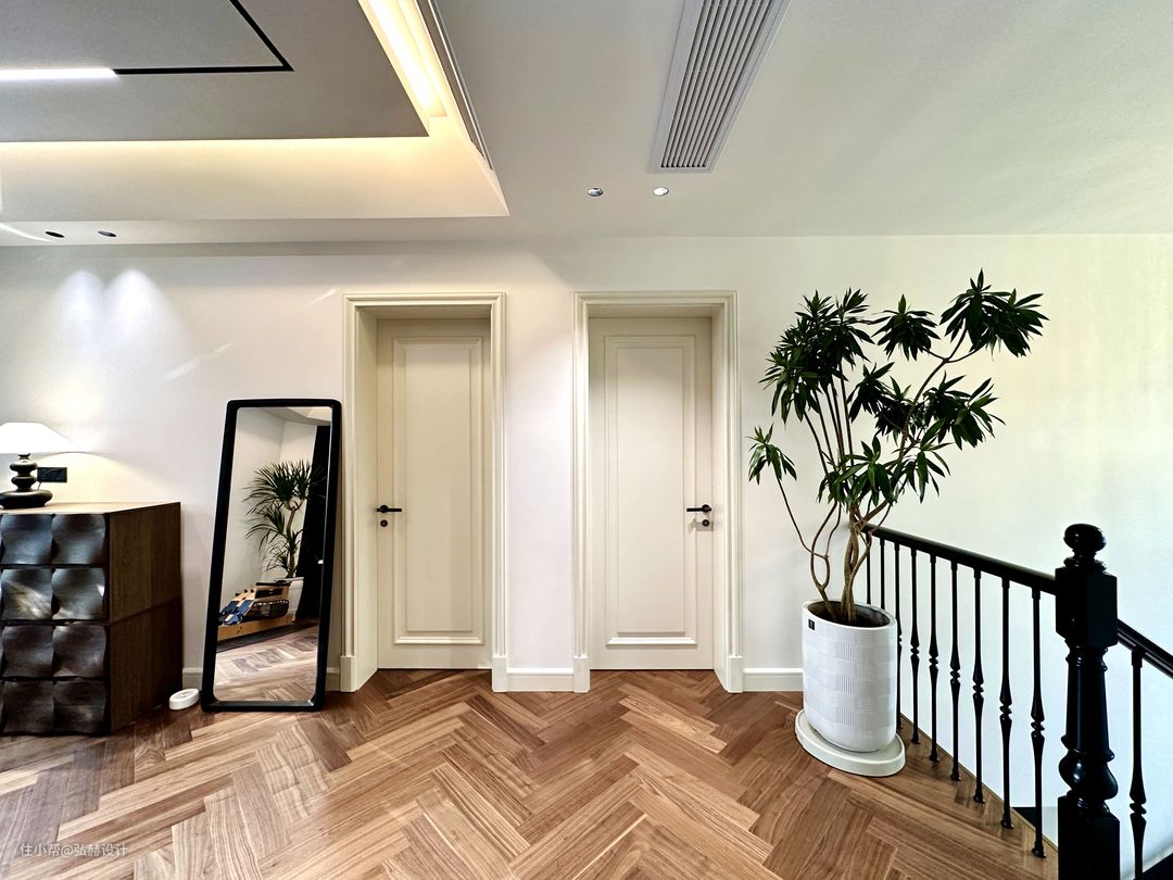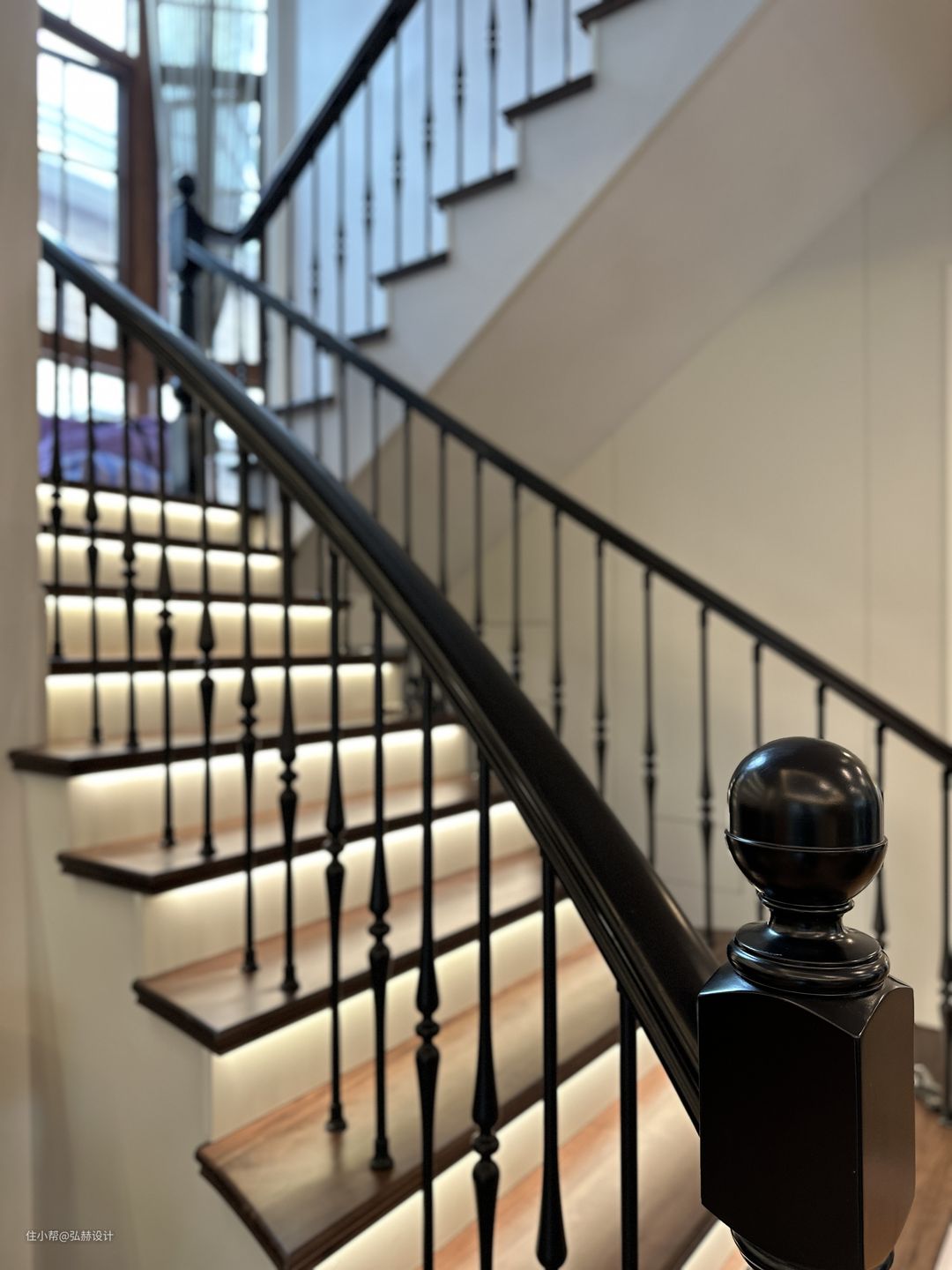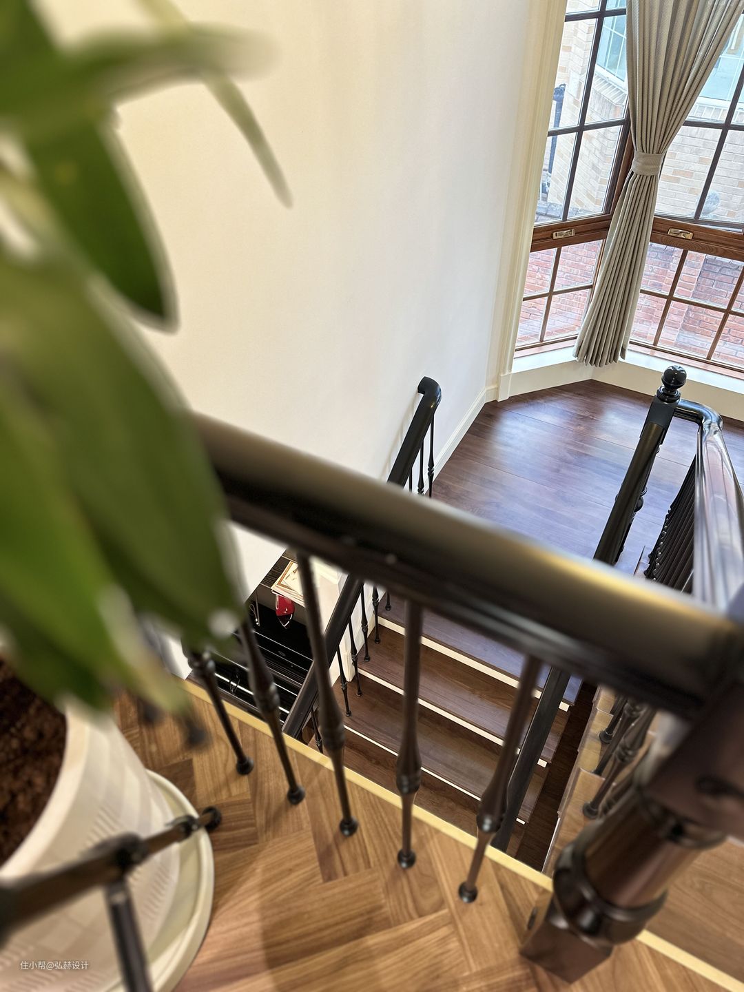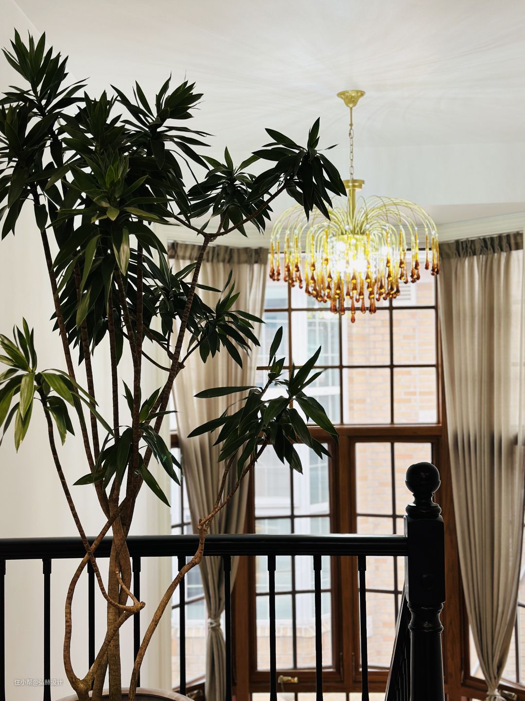 “细节”楼梯踏步和扶手的材质是黑色带有复古花纹的设计元素,从一楼延申至二楼,弧形造型感也让楼梯成为了家里一大亮点!水滴灯的造型以及色彩和绿植也为黑色楼梯提升了亮点,为楼梯间区域增加了活力,不会显得压抑!