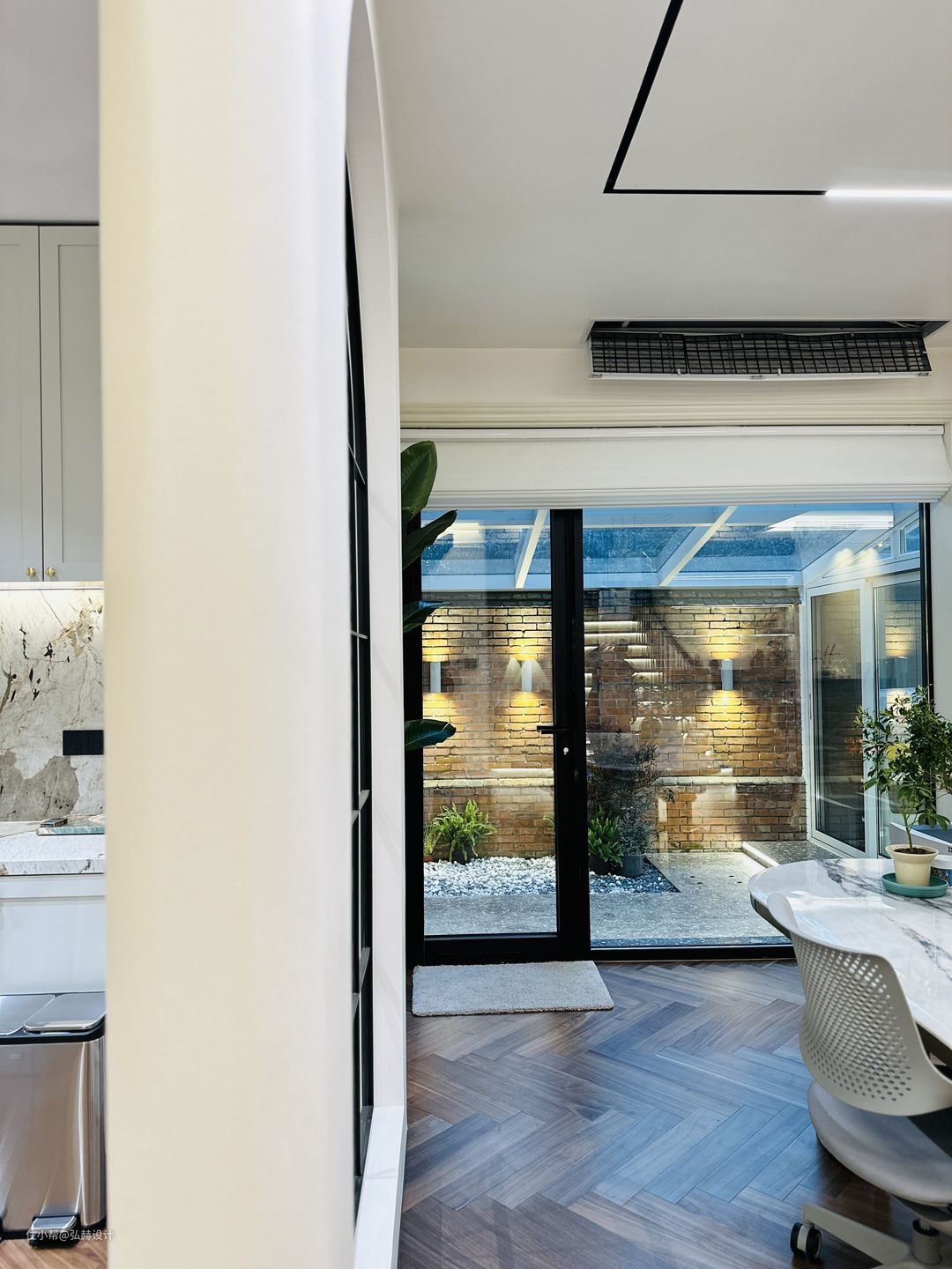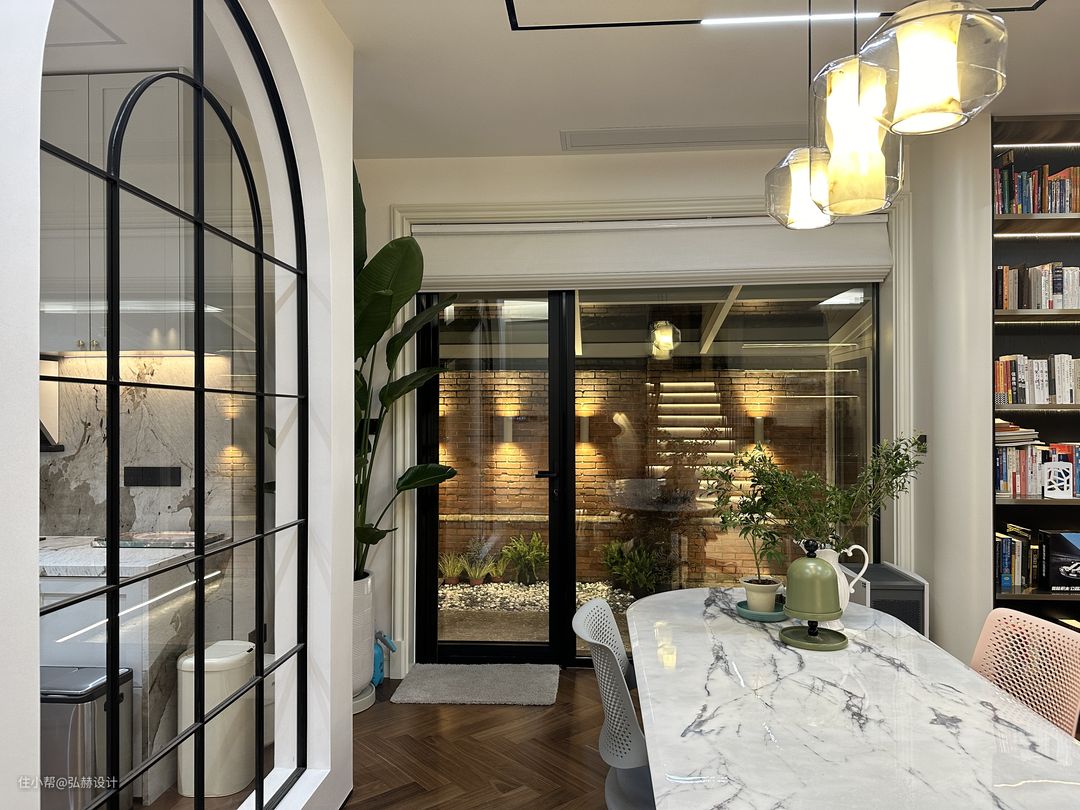 “静”阅读区成为客厅和餐厨空间的分隔,书桌后面的造型门洞,给阅读区增加了仪式感,复古格调瞬间提升!圆弧造型墙上艺术漆的质感也给大白墙增加光泽感!从阅读区通往户外造景区,将室外的景色引入到室内,在安静的空间可以欣赏到红砖绿景