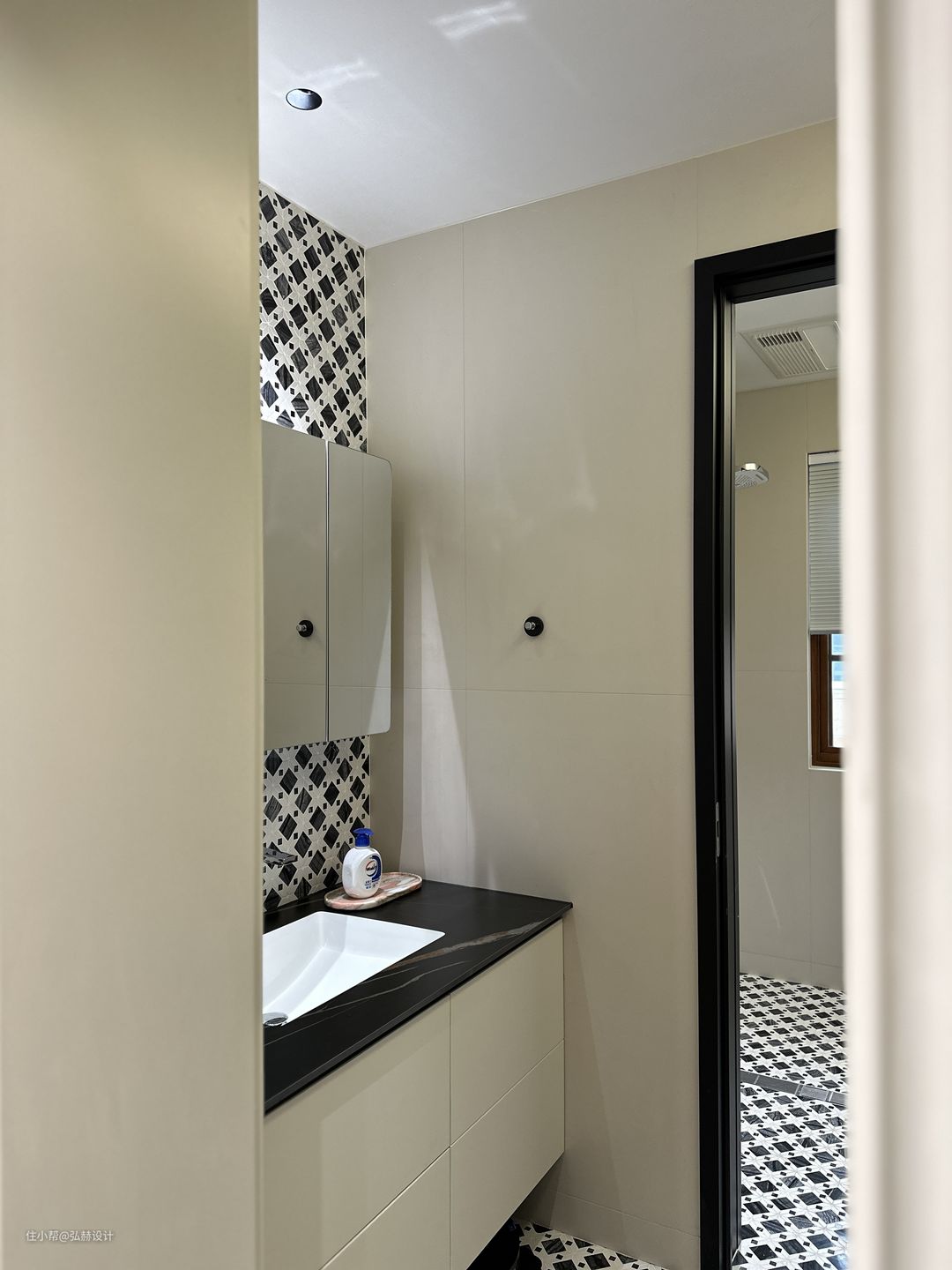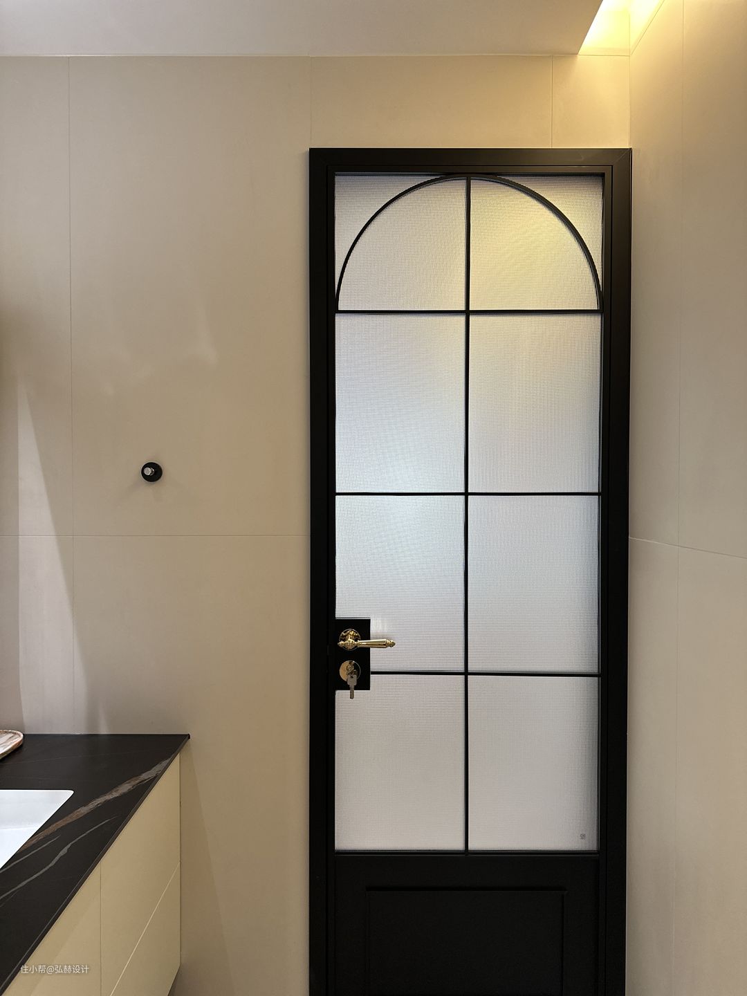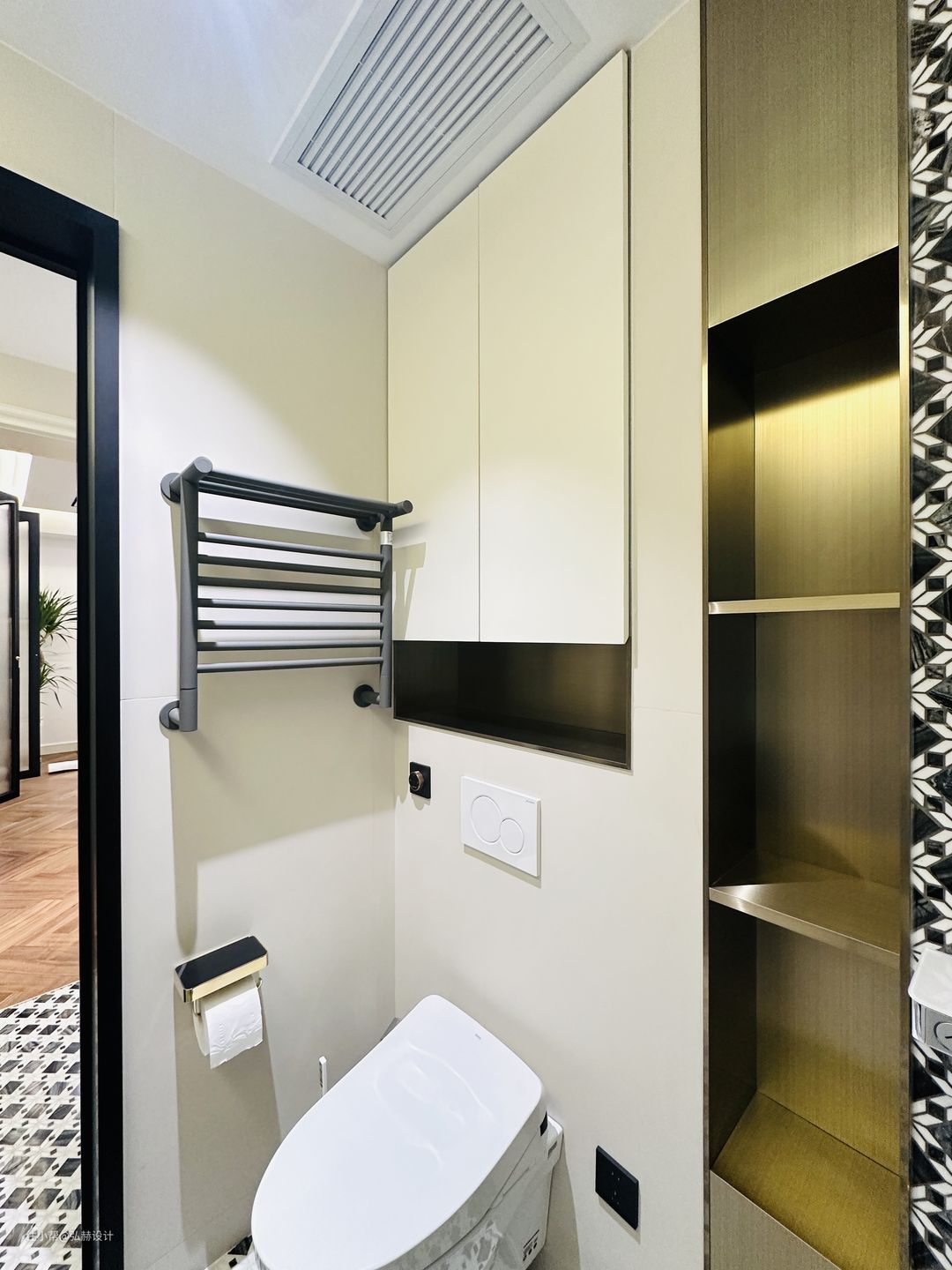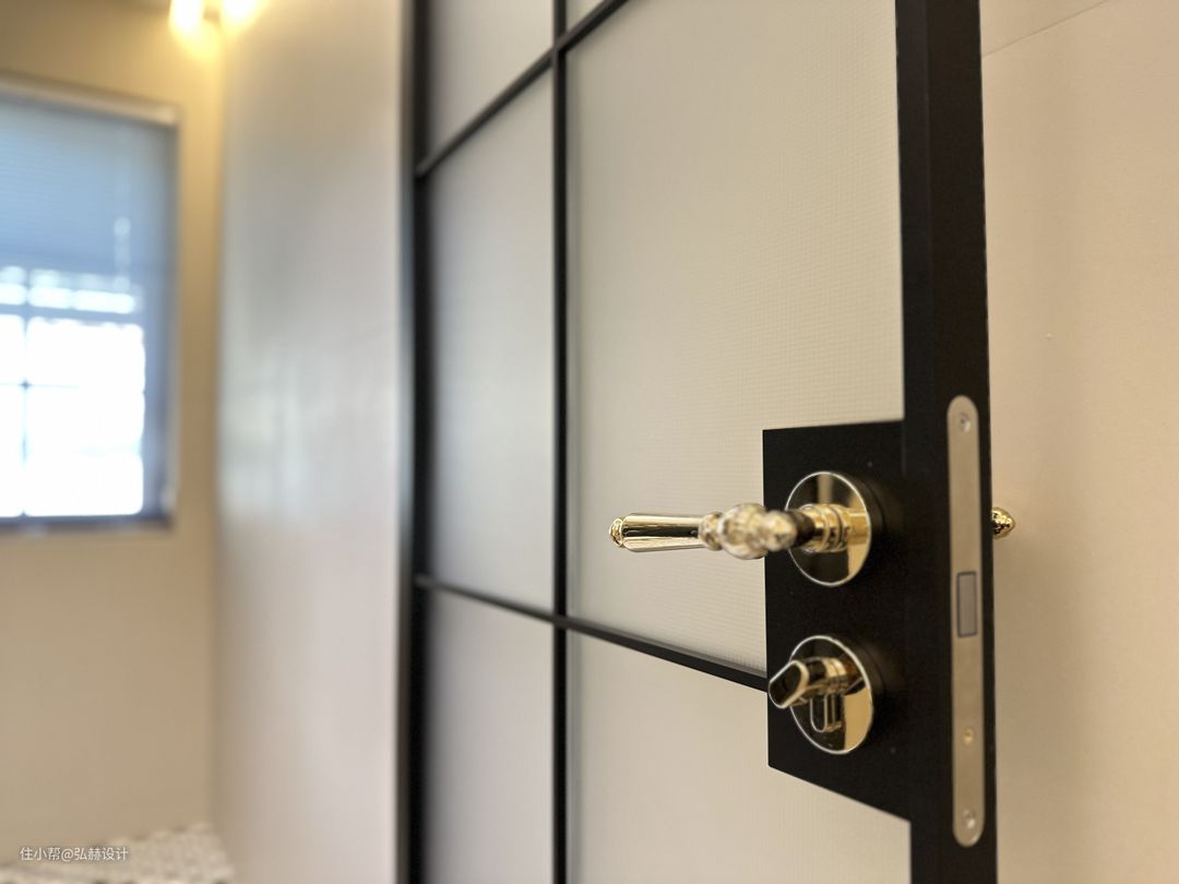 “细节”二楼次卫同样是复古的设计,黑白相间的复古花砖+铜条的结合设计,搭配黑色造型门,复古格调满满!淋浴区和马桶区的壁龛也是用全铜的材质,细节感满满!