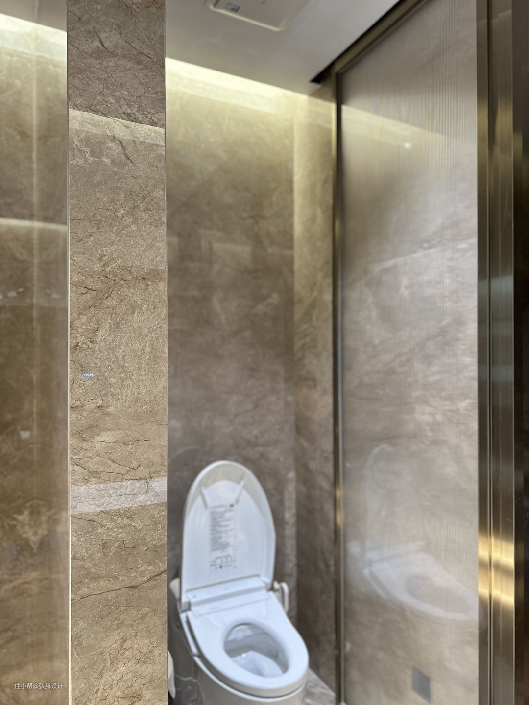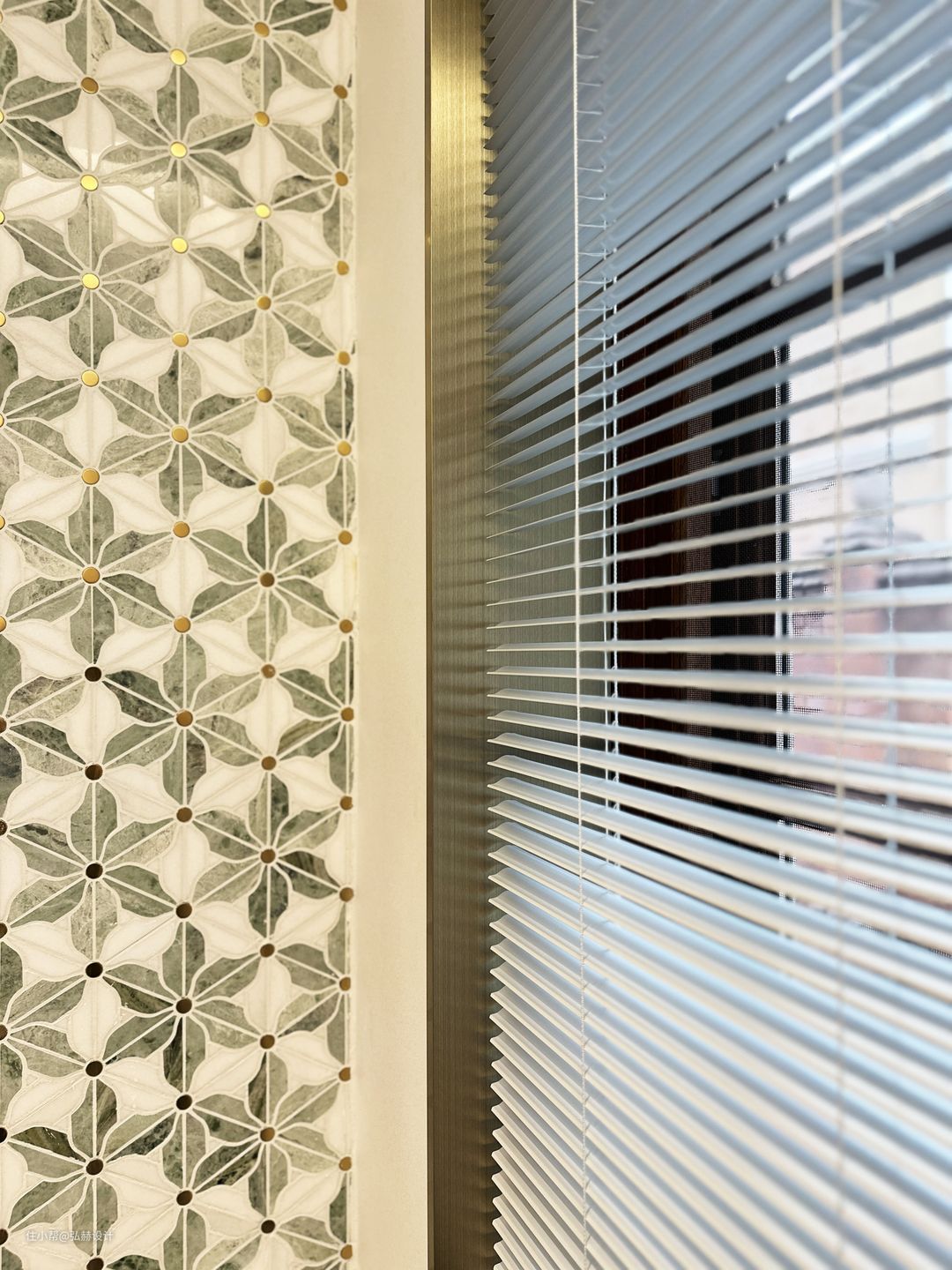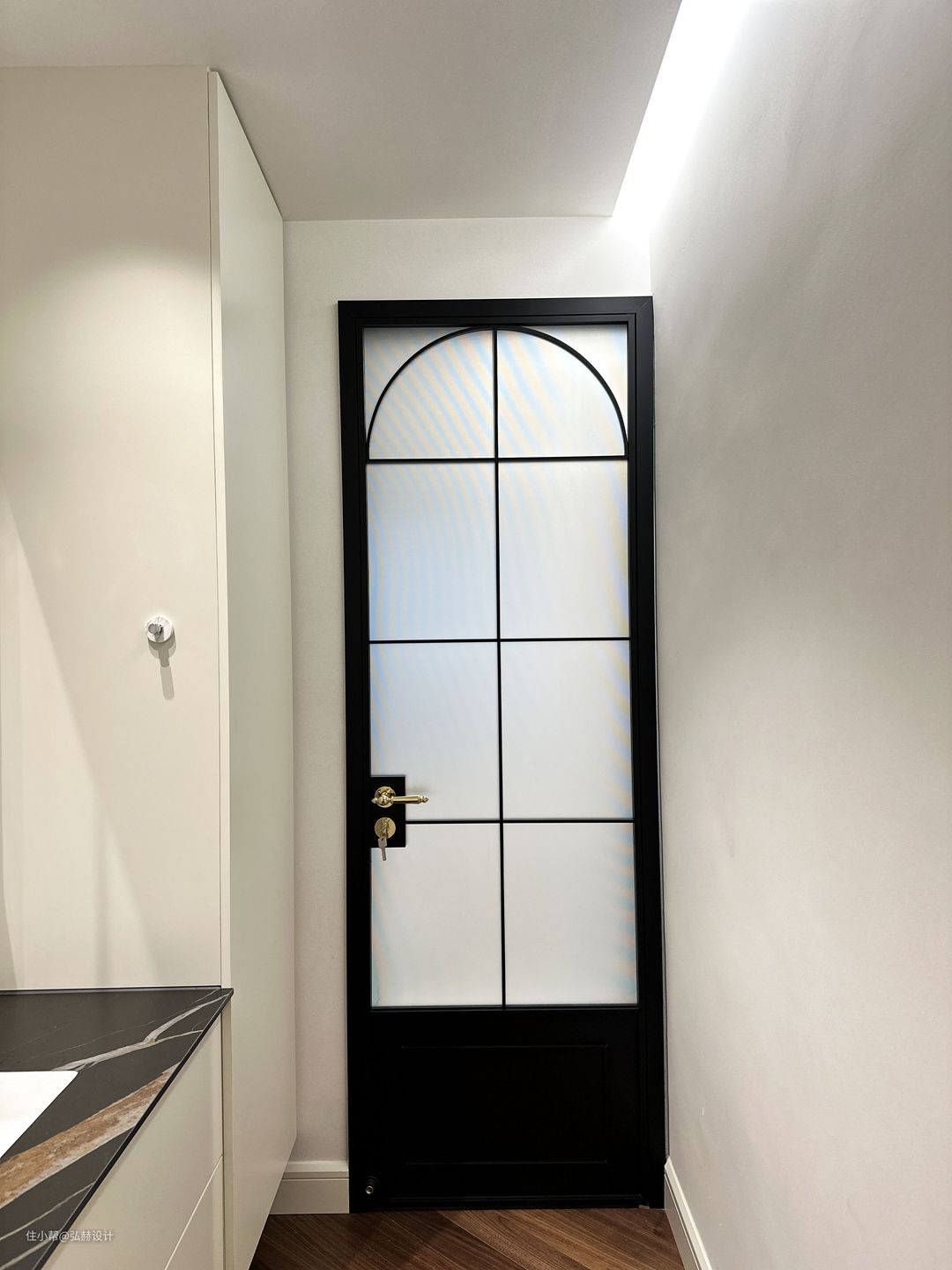 “细节”二楼次卫同样是复古的设计,黑白相间的复古花砖+铜条的结合设计,搭配黑色造型门,复古格调满满!淋浴区和马桶区的壁龛也是用全铜的材质,细节感满满!
