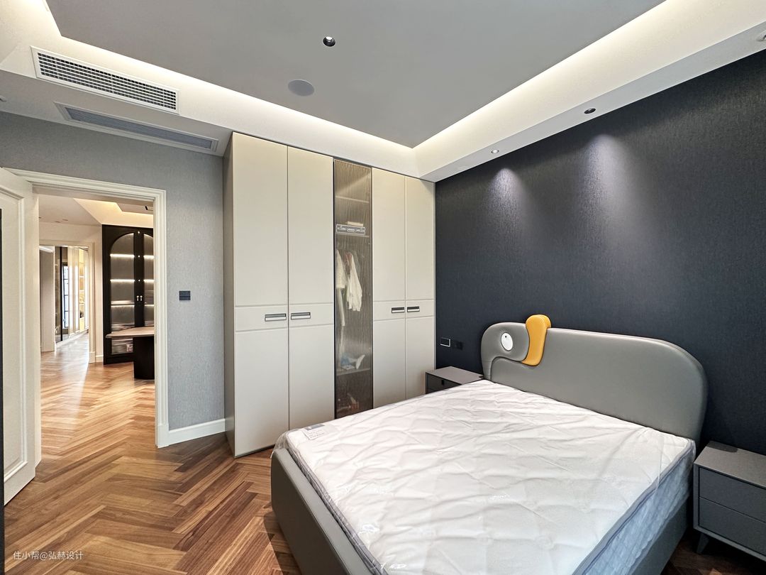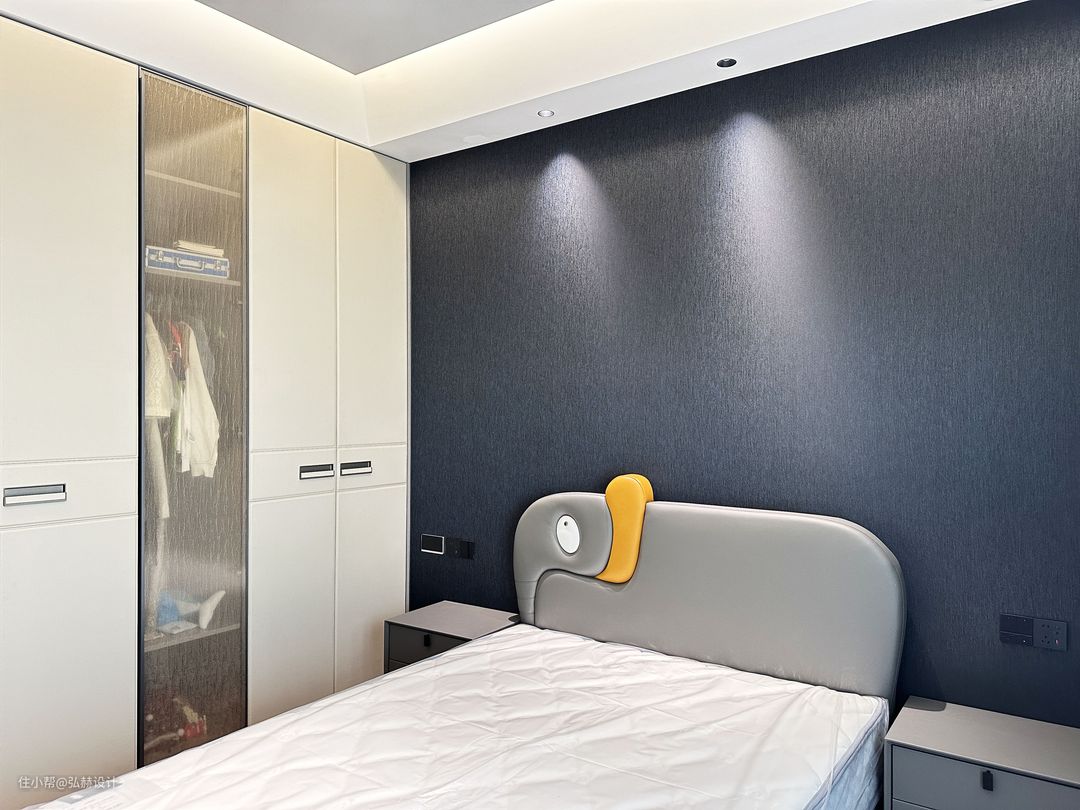 “静”儿童房的设计简单,藏蓝色+高级灰的碰撞,展现出男孩的帅气且个性的味道!床头一抹“黄”的点缀,也体现他活泼而阳光的内心!