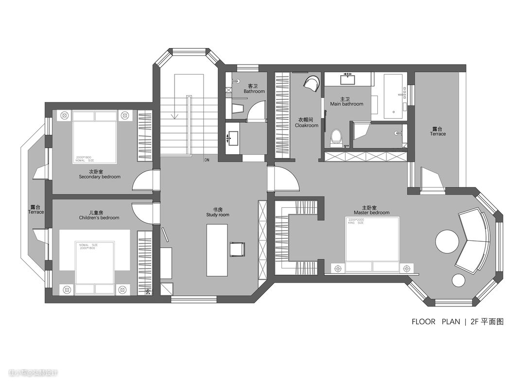 1F 改造方案: 1.门厅区域打通墙体,扩大玄关面积,增加了鞋柜,换鞋凳,收纳储物,挂衣区等,满足了入户的一切收纳需求,同时用柜体的设计来起到阻隔作用,美观和实用并存的一个入户玄关! 2.敲除厨房的墙体,将厨房和西厨,平时的就餐空间连在一起设计,为一家人的生活增添了互动乐趣,不再是独立的餐厨空间,同时也将室外的空间引入到客厅里,采光和通风满足了一楼! 3.餐厅中岛的设计,高低错落的柜体设计,弱化了入口一通到底的视觉感,起到视觉上的隔断效果! 4.打通了车库的墙体,作为一楼增加老人房+卫生间套房的设计,满足了老人起居的方便,距离厨房也比较近! 5.取消客卫的空间,改造成独立的杂物间,毕竟一家人的生活,收纳是很重要的! 6.根据尺寸的推断,还可以预留一间客卫,也让扫地机器人有处可存放! 7.将洗衣房的门从客厅侧边的进入,经过室外造景区进入独立的洗衣区!从客厅到阳光房通往花园,再到洗衣房,再到客厅,将整个区域形成洄游动线,打破死角的缺点! 2F 改造方案: 1.二楼上去的地方改造成开放式的书房,为了给主卧室做延申空间,他们喜欢一个安静的区域来工作,二楼则是他们的私密区域! 2.主卧室通往露台的门改在侧面,将门口的区域分别给到主卫和书柜的收纳,将卫生间的门放在最里面,让卫生间和衣帽间连在一起设计,解决了卫生间对着床痛点! 3.主卫门口利用原来的储物间,改造成壁挂式衣帽间,方便了使用,也增加了储物空间! 4.衣帽间的门改在了另一边,U字型的衣帽间,储物功能满满,也不用再绕到门口才进入衣帽间了! 5.将主卧室原有零碎的小空间,改造成一个套房,每个独立的空间都很宽敞,将浪费的面积都利用上了!