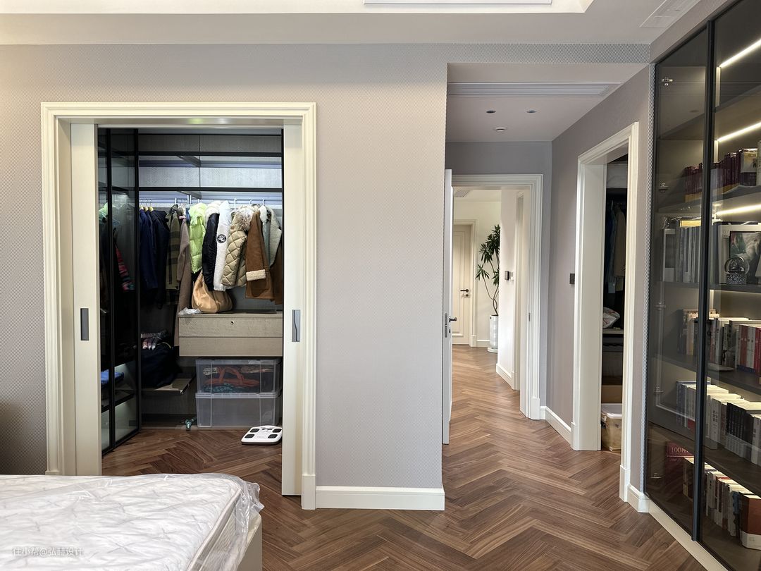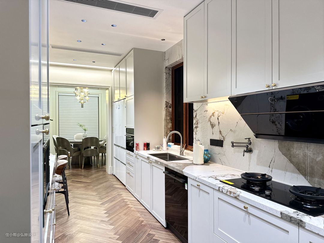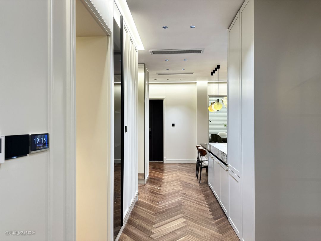 他家比较重要的一个施工重点:原有地面是地砖,地砖下是地暖,在装修成本比较节约的情况下,也考虑到为了让地暖导热性不受影响,我们选择了铺设9mm的实木地板(人字铺贴)采用德国进口胶湿铺的方式,也就解决了这个重要的问题!改造后空间感更加的通透,独立的客厅、餐厅、厨房、西厨区域,洄游动线也是他家的一大设计特点!全屋智能灯光,智能开关为他家生活实现了便利!
