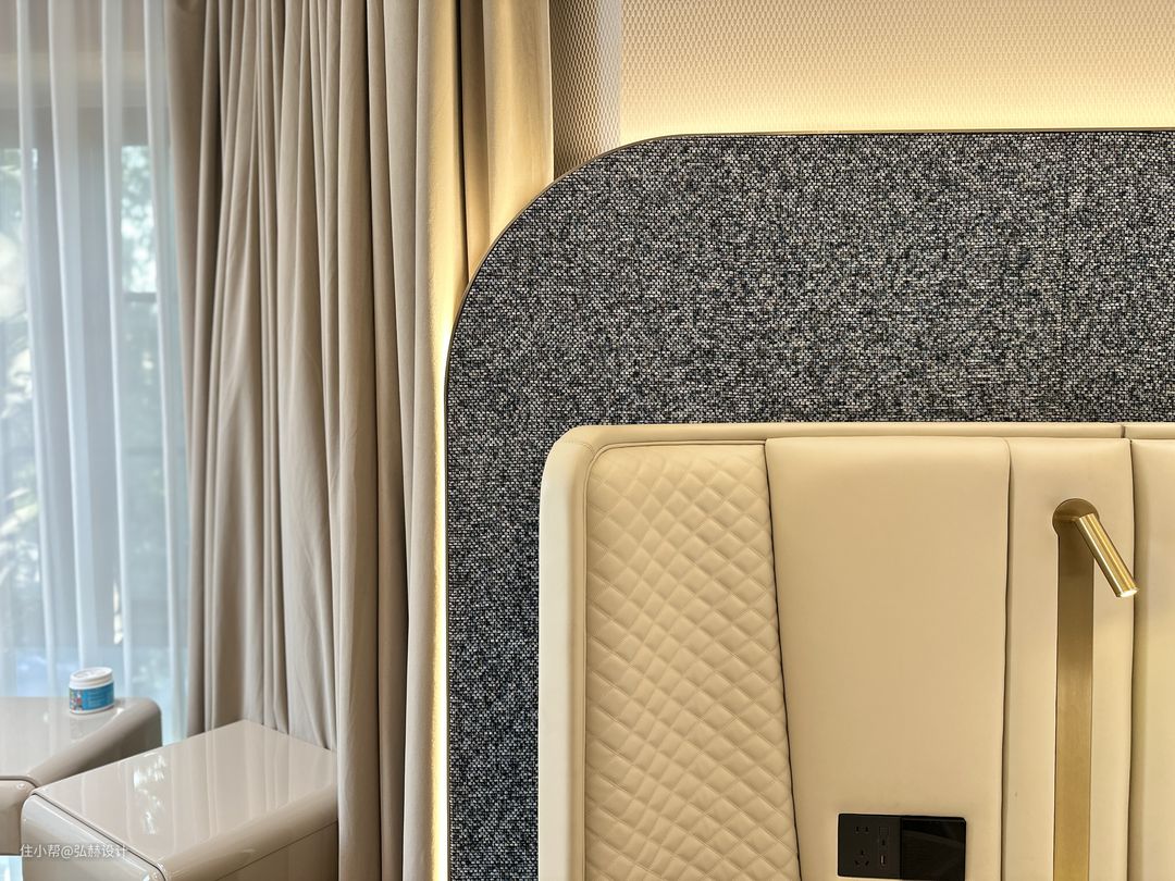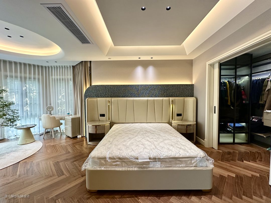 “静”主卧室的温馨感铺面而来,墙面素雅的墙布,背景墙用沙发面料做成硬包,为这张仪式感满满的床增加了厚重感,3500K暖光的渲染,让卧室空间舒适且安静;八角形落地窗户区域作为女主休闲、梳妆的独立空间,在自然的光线下一切都变得柔和了!