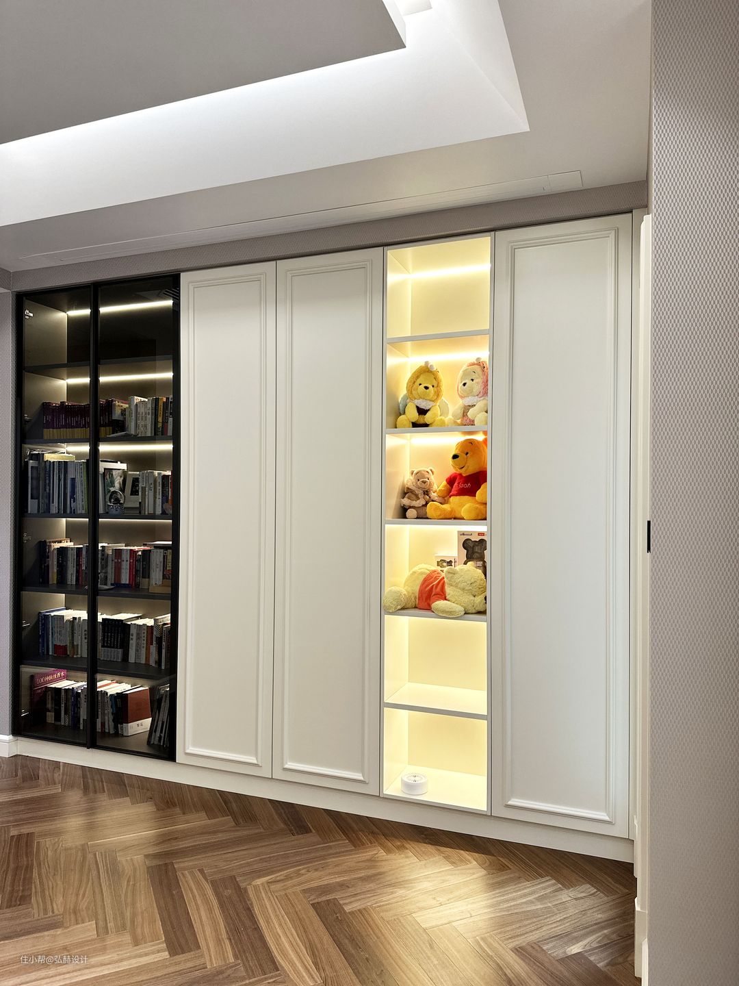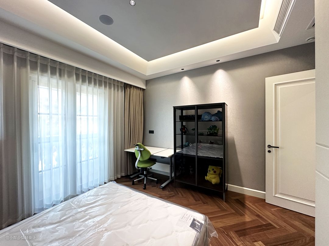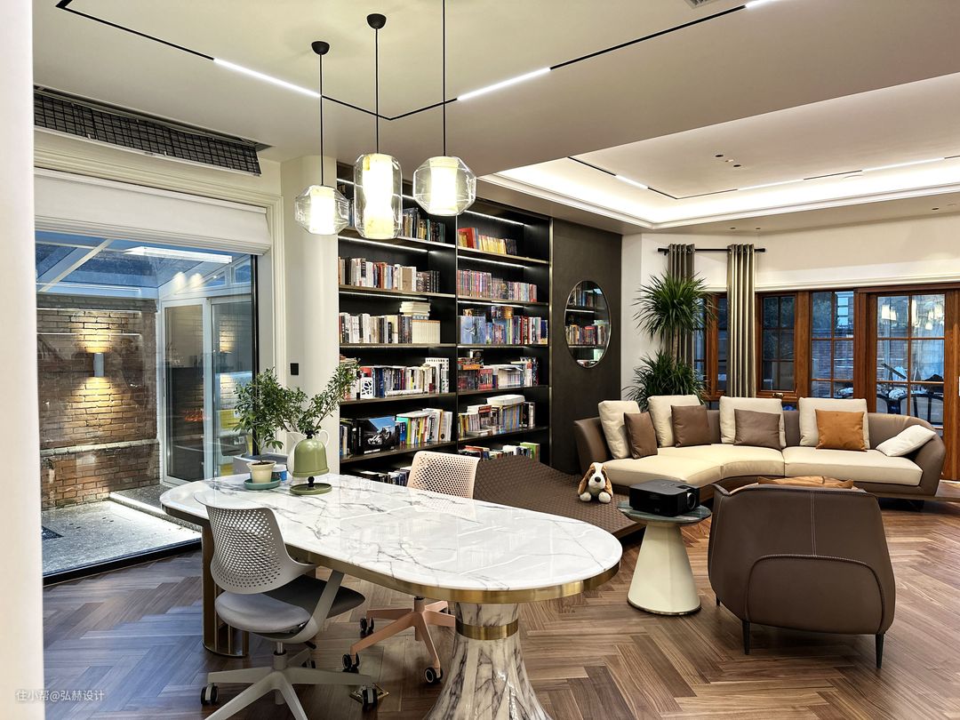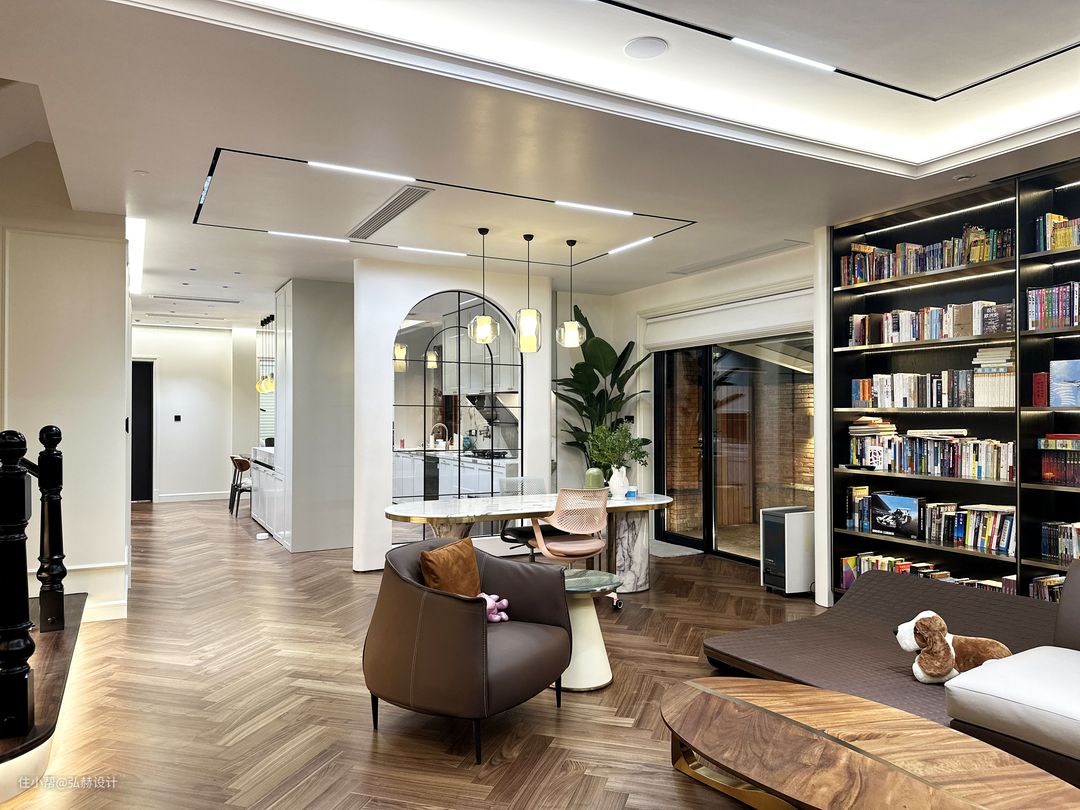 “可静可闹”全屋人字铺地板的设计,让整个空间显得更加协调且统一性,延伸感满满!客厅+书房+休息区,三个功能满足了家人的生活需求,可静可闹!满墙的书柜设计,满足了孩子的书籍收纳,书柜造型移门的设计,为客厅增加了背景的仪式感,打破了传统柜门的压抑感!法拉利沙发的造型感,也为客厅增添了趣味性!