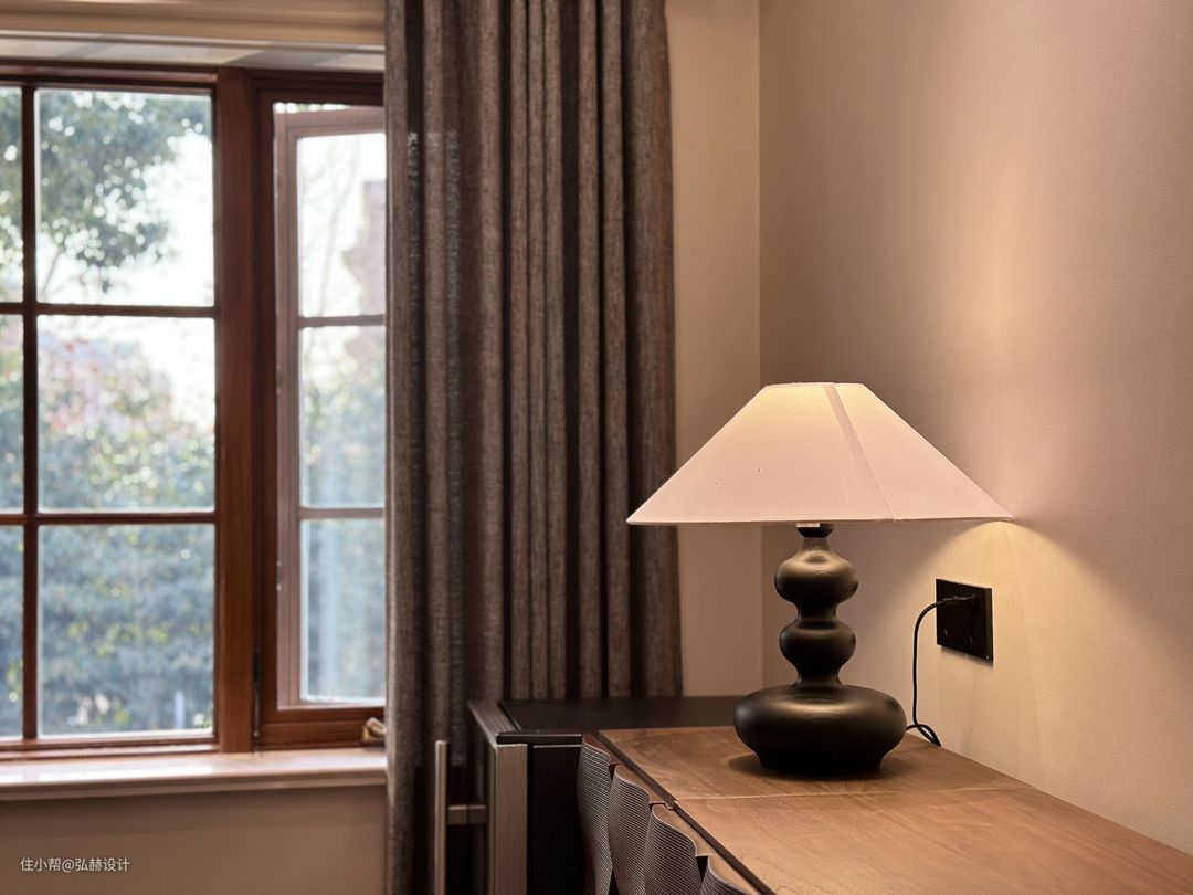 “静”二楼书房虽是开放式,但也是他们私密的空间,安安静静的处理工作中的事情,在喧闹中找到一个静的区域!黑色造型的复古书柜也是他们中意的元素,书桌的台面是胡桃木材质,复古的格调满满!