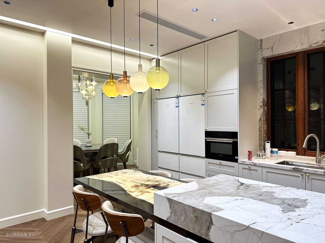 ”烹饪”两排一字型的柜体设计,高低错落的柜体设计,不仅可以起到隔断作用,也让餐厨空间更有层次感!亚克力和木头结合的餐桌,个性感满满,让人就餐时都充满食欲!餐桌台面和中岛的设计,采用了穿插的设计手法,让两种材质的碰撞产生密切联系!马卡龙色系的吊灯,为整个空间增加了一丝活泼的味道!卡萨帝的这款双开门零嵌冰箱效果真的很棒,让冰箱和柜体整体统一了!