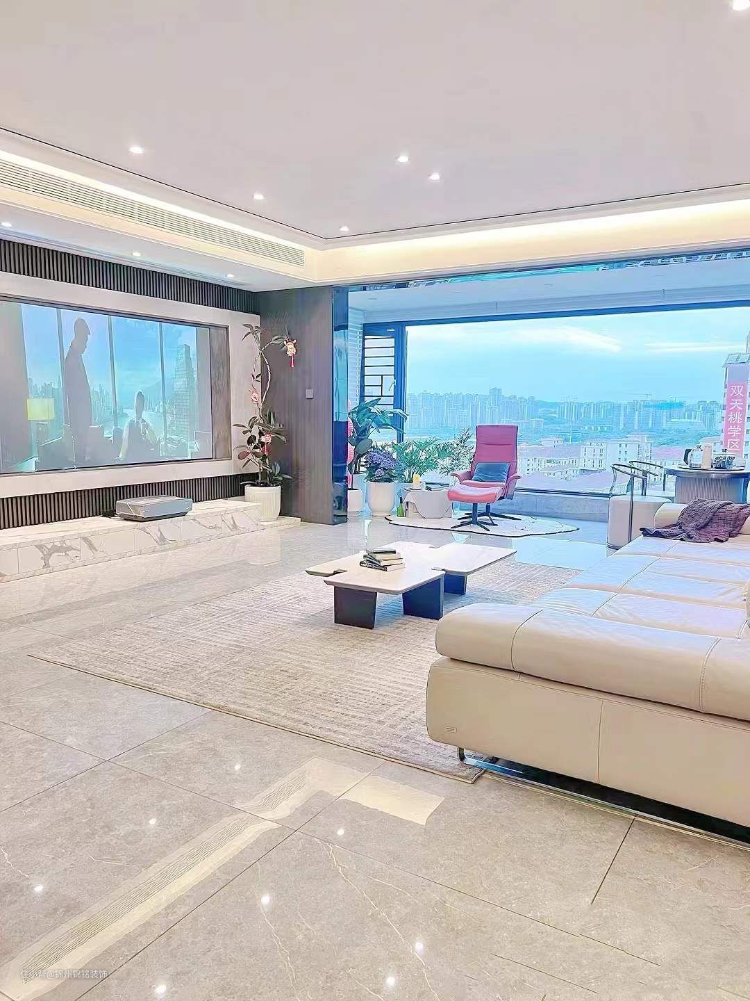 打通后客厅面积变大视野更加开阔,也不会受季节天气变化影响使用,一边放茶台相当于多了一个小茶室,一边打造成 精神角落,绿植鲜花咖啡,这里看书简直太舒服了。简约电视背景墙,家用100寸激光电视+简单护墙板打底。多做了一层会看起来电视墙更有层次感,四周做灯带,氛围会更好也非常温馨。悬浮平顶吊顶无主灯,造型简单简约,不压层高,无主灯更显高级感,光从四周发出来对空间有延伸性,灯带的光感给人更舒服的感觉。