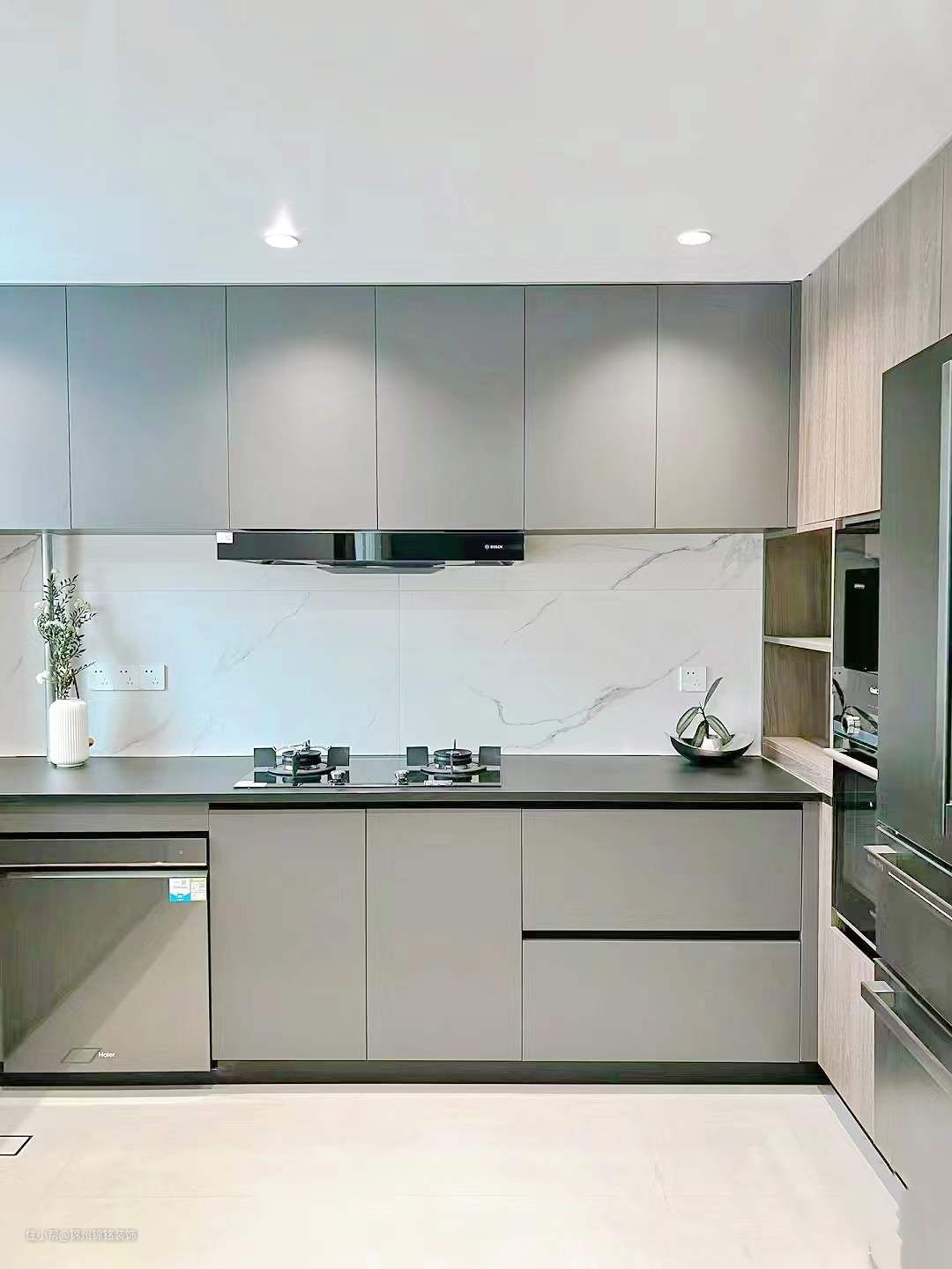 传统u字型, 选择了吊轨灰玻双联动门,敞开和合上都会是不一样的体验。深灰色柜体/黑色岩板台面,水槽选了悍高的全能大单槽,沉稳大气, 有一种浑然天成的感觉,氛围感拉满。