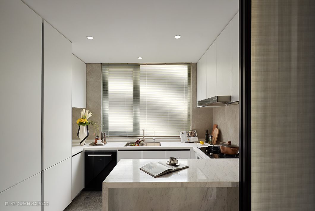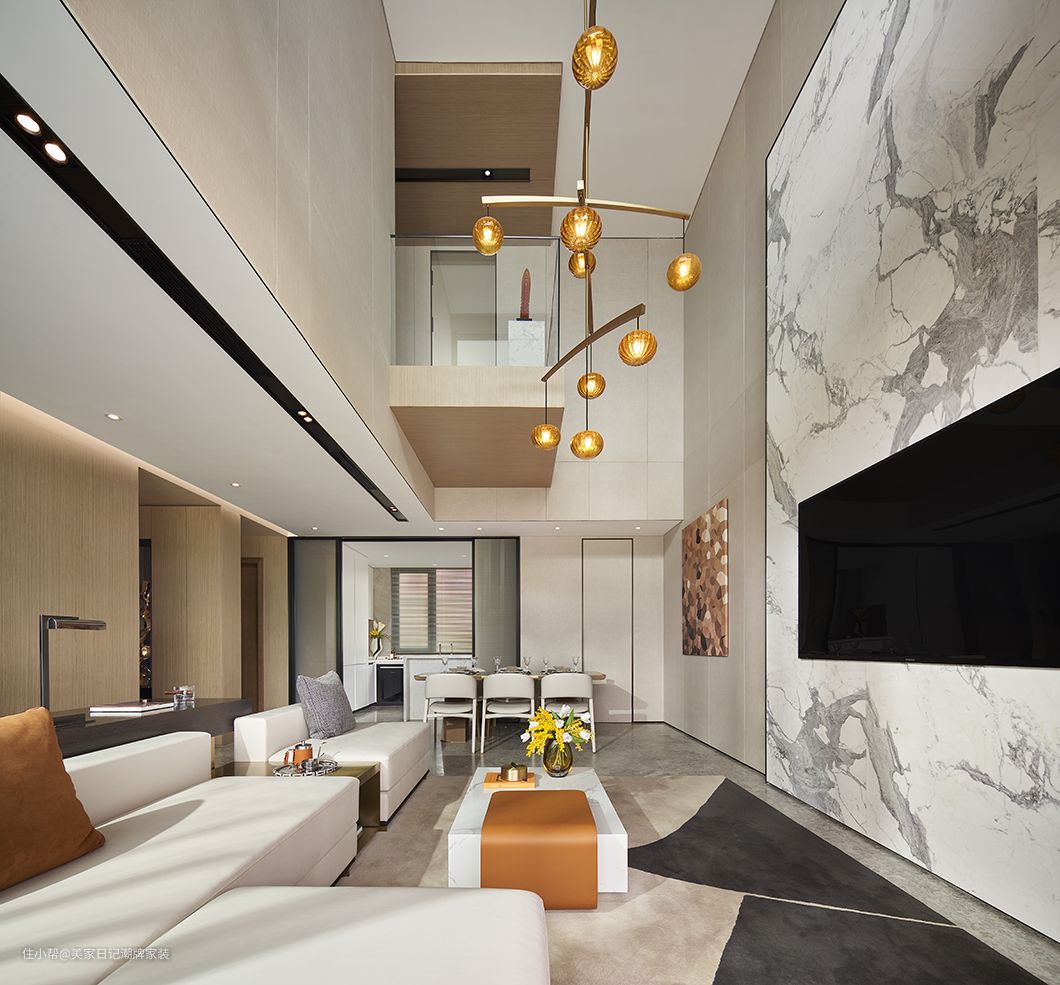 客厅中加入了大理石肌理,巧妙迎合了奢华感十足的吊灯。淡雅色调的家具中偶尔融入了金属元素,光泽感在白色雾面中偶然跳跃,让家柔和亦不失生动。