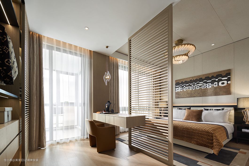 卧室与更衣室联通,木质格栅半墙悄悄在两个区域之间创造界限,这样一来,两个区域在视觉和动线上依旧未分割,只是在居住的大主题下有了不同的概念。