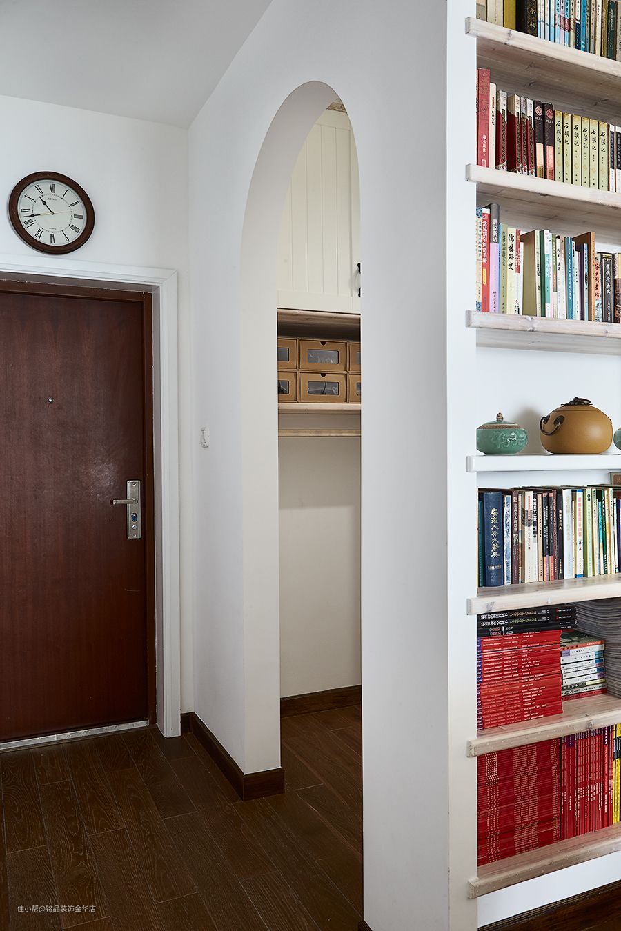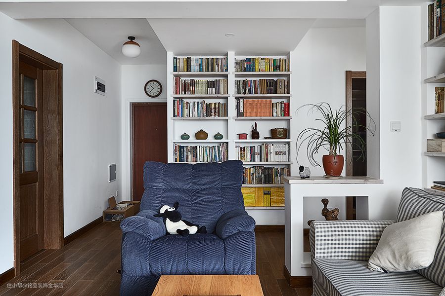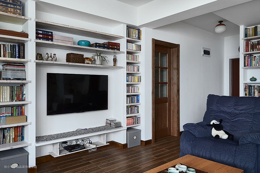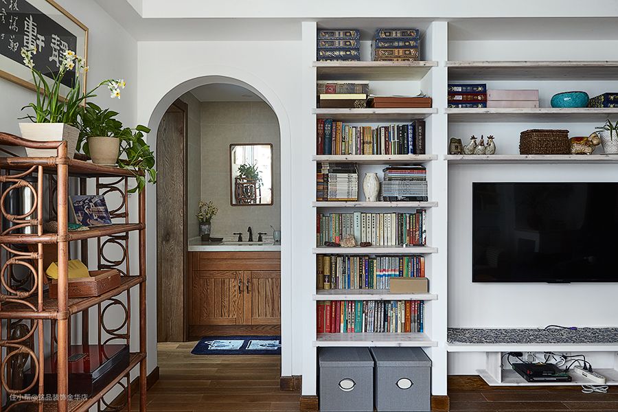 深色系的原木地板也带着做旧的气息,整个家色调和谐统一。电视背景墙是留白墙面+简洁收纳的设计,除了电视机区域,其它都用置物板增加收纳空间,放展示品和书籍,视觉上清新又高级。一旁拱形墙后的区域是卫生间和卧室。 所有的墙面都没有做造型,而是定制了“或隐或现”的通透型书架,不拘泥于收纳用途,旨在营造一种悠然自得,独特生活的空间氛围,形成视觉乐趣。刚完工时感觉空荡荡,但家具等物品搬进来之后,平衡的生活空间得以实现。 从客厅望向阳台视角,家里的茶几、边几,收纳架都是用原木和铁艺材质组合而成的,很有时代特征,简约而复古的造型,将小屋填满。