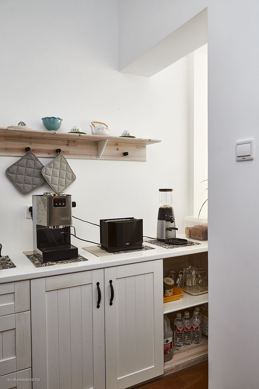 餐厅没有做常规的设计,而是在原次卧靠窗空间设计了一个西厨,偶尔煮煮咖啡、烤烤面包非常惬意。屋主积极向上的生活方式,投影于旧家具及旧物品的共同居住空间中。白色柜门、黑色笑脸拉手、原木搁板,餐垫,满满手工感。