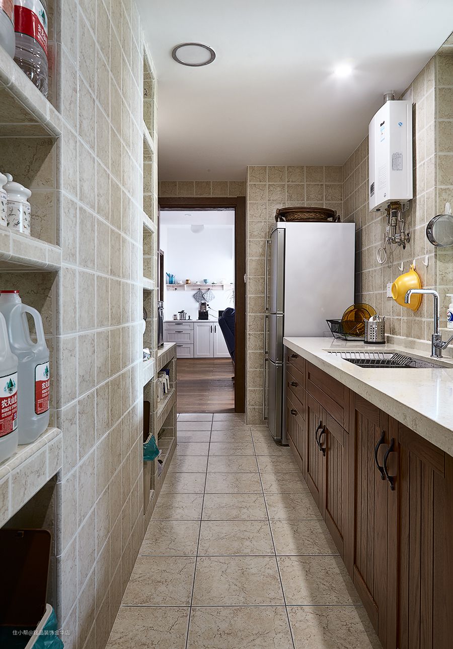 厨房靠墙做了I字形橱柜,另一侧墙面留出壁龛,用来置物,整体是走廊式的格局。