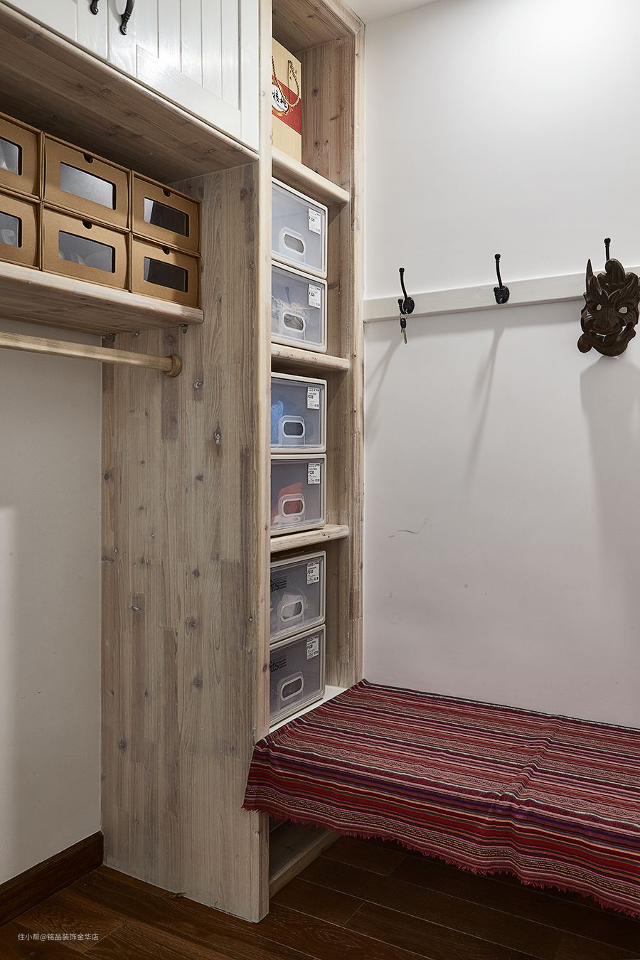 将原户型中的次卧改造成入户换衣间、衣帽间,并同时增大客厅空间。入户换衣间也是隐藏的玄关区域,有换鞋凳、挂衣区、放鞋区,还有一排挂钩可以收纳钥匙等零碎小物品。 换鞋凳用复古的毛巾做铺盖,增加怀旧感。开放式的格体里放满了鞋盒,里面收纳了屋主的鞋子,因为这里不常住,所以在有限的区域里完全可以满足屋主的收纳需求。