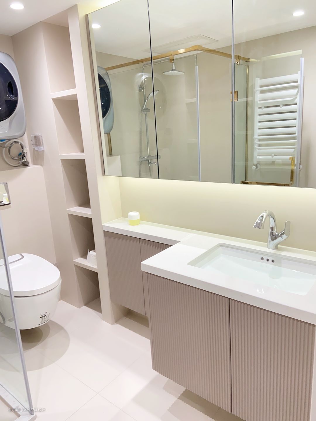 女儿房的卫生间装修得真是太美了!我们选择了粉色的浴室柜门板,颜色非常女孩,让人感觉非常舒适。 干湿分离的设计让整个卫生间更加整洁和易清洁。 镜柜的设计非常实用,可以放置洗漱用品和化妆品,而且还有一大面镜子,方便化妆和整理。 湿区则做了壁龛设计,可以放置毛巾和浴巾等物品。我们还安装了专用的壁挂洗衣机,方便清洗小件衣物。整个卫生间既时尚又舒适,让生活更加美好。
