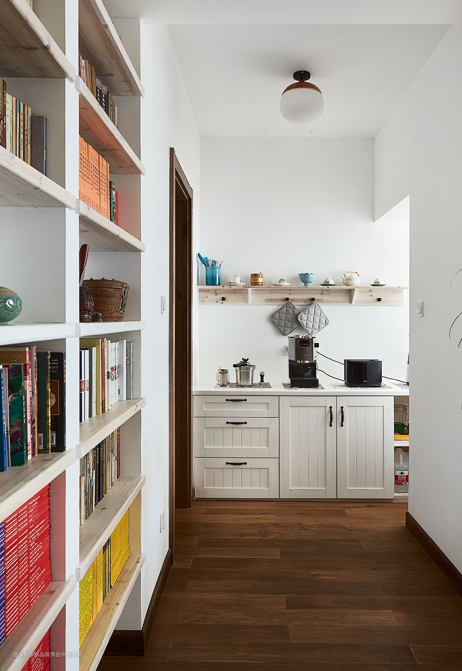 餐厅没有做常规的设计,而是在原次卧靠窗空间设计了一个西厨,偶尔煮煮咖啡、烤烤面包非常惬意。屋主积极向上的生活方式,投影于旧家具及旧物品的共同居住空间中。白色柜门、黑色笑脸拉手、原木搁板,餐垫,满满手工感。
