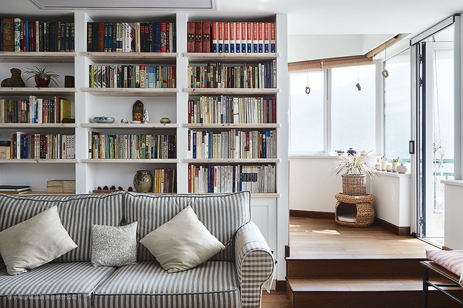 深色系的原木地板也带着做旧的气息,整个家色调和谐统一。电视背景墙是留白墙面+简洁收纳的设计,除了电视机区域,其它都用置物板增加收纳空间,放展示品和书籍,视觉上清新又高级。一旁拱形墙后的区域是卫生间和卧室。 所有的墙面都没有做造型,而是定制了“或隐或现”的通透型书架,不拘泥于收纳用途,旨在营造一种悠然自得,独特生活的空间氛围,形成视觉乐趣。刚完工时感觉空荡荡,但家具等物品搬进来之后,平衡的生活空间得以实现。 从客厅望向阳台视角,家里的茶几、边几,收纳架都是用原木和铁艺材质组合而成的,很有时代特征,简约而复古的造型,将小屋填满。