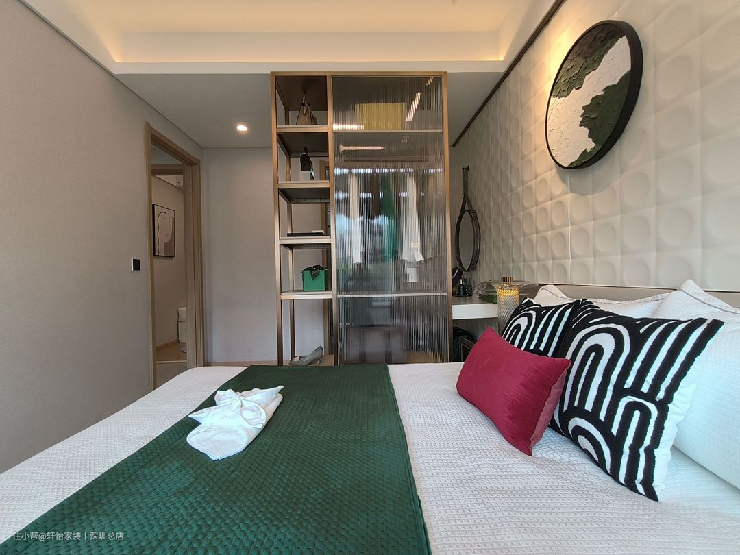 对于次卧的装饰方案,削减了留宿客人的储藏空间,在此基础上强化了墙面设计的艺术感。其中,黑色金属搁板的墙面布局为房间提供了视觉焦点,同时,一幅黑色抽象的装饰画也为整个空间的设计风格注入了艺术气息。