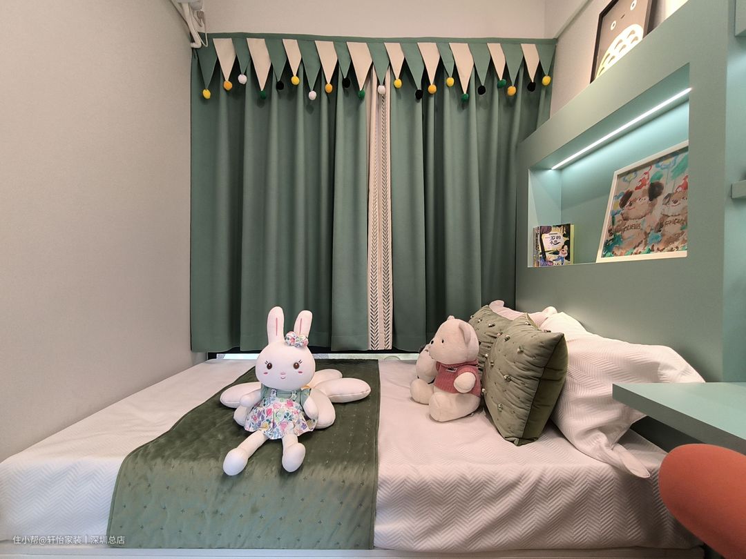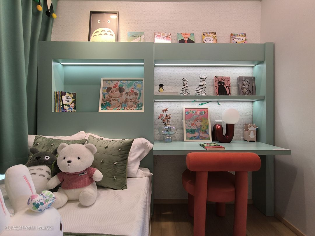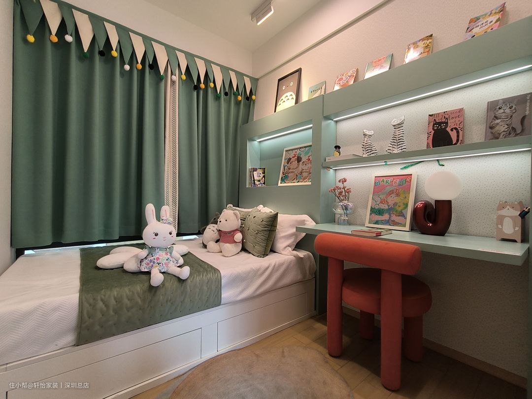 在儿童房里,翠绿的色彩映入眼帘,环保翠绿漆涂饰的壁龛,嵌入灯带之后更显梦幻美感。壁龛中陈列的书籍和饰品,方便小朋友轻松取用。一体化书桌与床头紧密相连,节省了床头柜的空间。凳子的高度与小朋友的身高极为匹配,使得这一方天地更显和谐舒适。