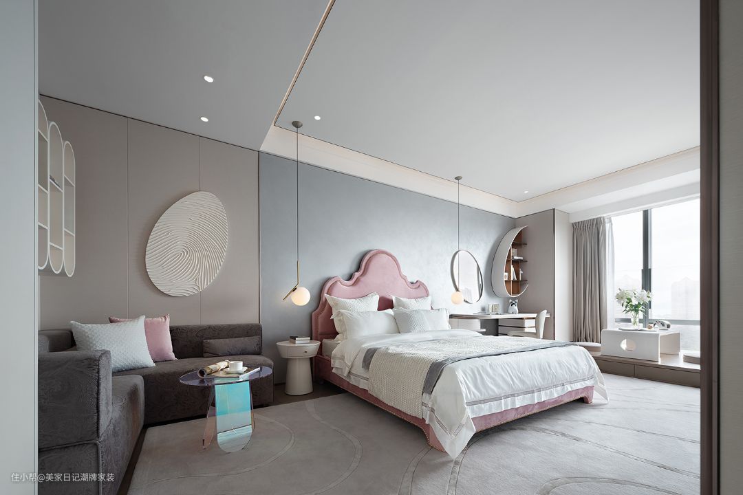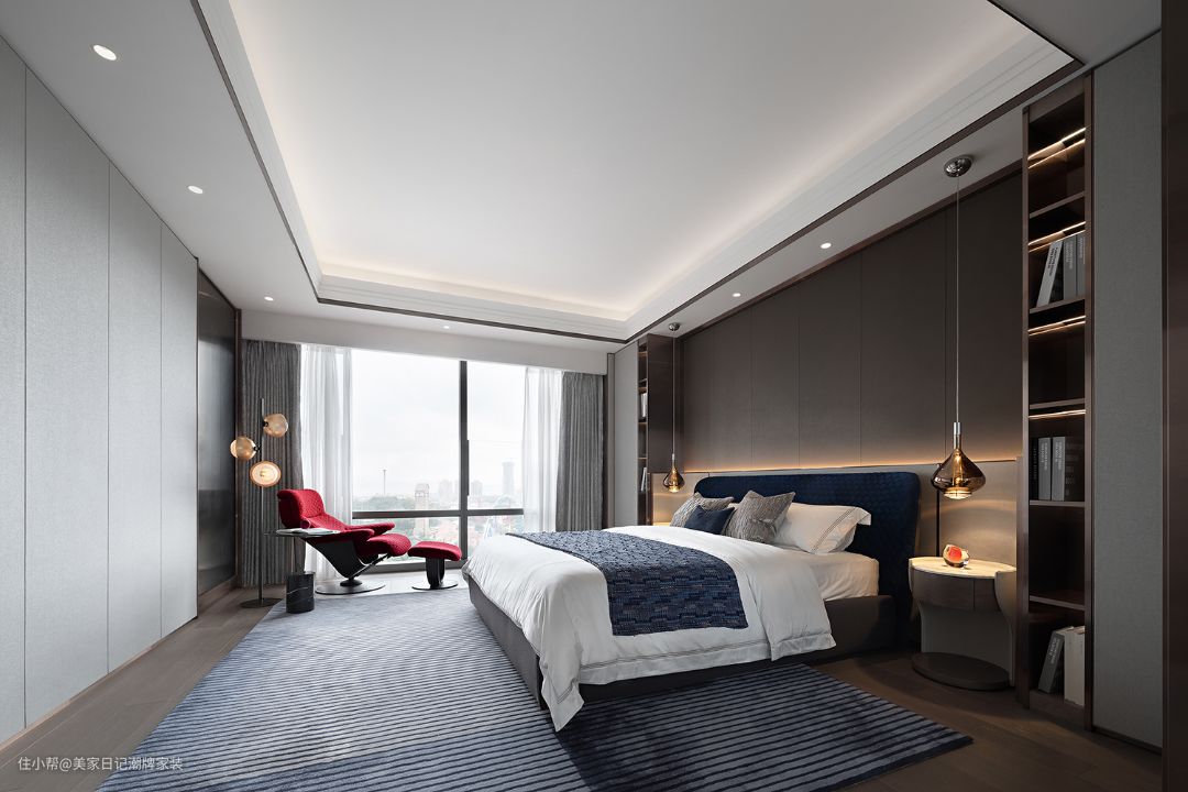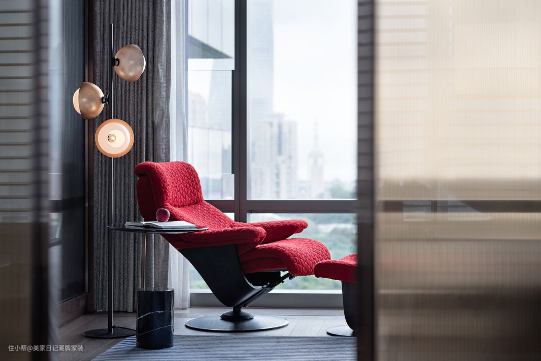 主卧室以简约风格为主,但依然充满仪式感。靠窗位置,设计一张红色躺椅,可悠闲的躺在那里看外面繁华的街景。每天一回来,什么都不用想,往躺椅一躺,慢慢伴随霓虹灯和城市夜色入睡。