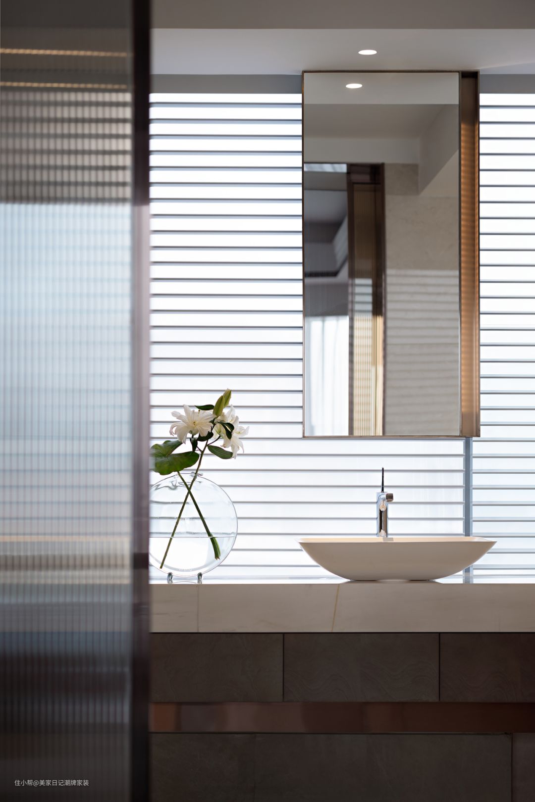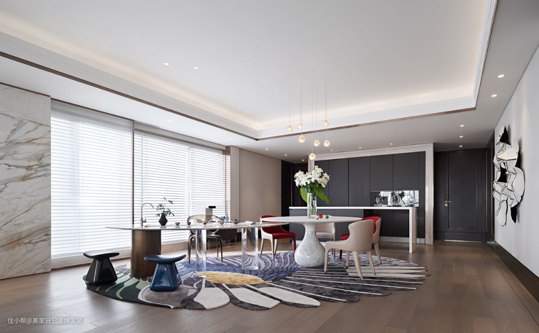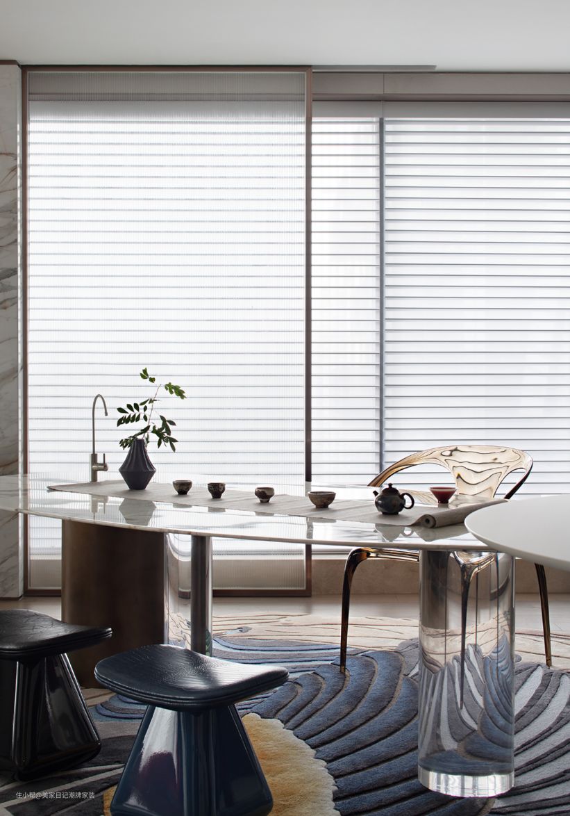 餐桌属于两座式无缝设计,一座餐桌可当成喝茶区域,其中采用玻璃为主材料,通透光亮,富含层次感。 另外一座餐桌,属于白色陶瓷设计,看起来既纯白简洁,还有一种轻奢风。而周围的座椅,井然有序的排列,和桌子形成首尾呼应的共鸣。