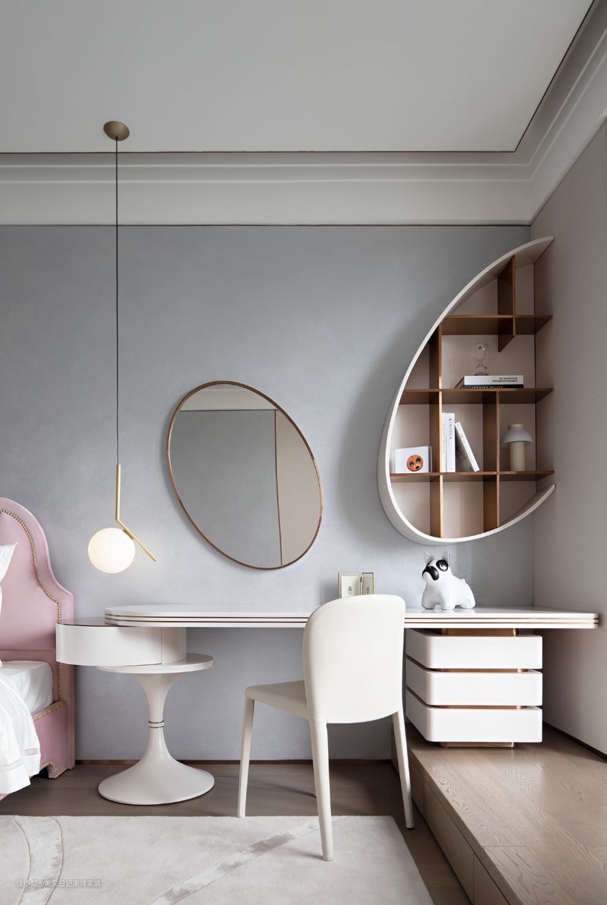设计时尚个性的椭圆镜,把角落的布景倒映出来,显得更开阔美观。半心形状的书架,构建动感弧线,使得整体更有亲切感。