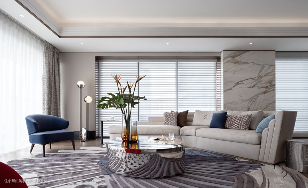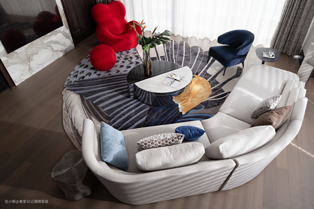 客厅采用优雅地毯混搭多种纹理,以不规则圆形风格设计客厅,形像一朵围笼之花。