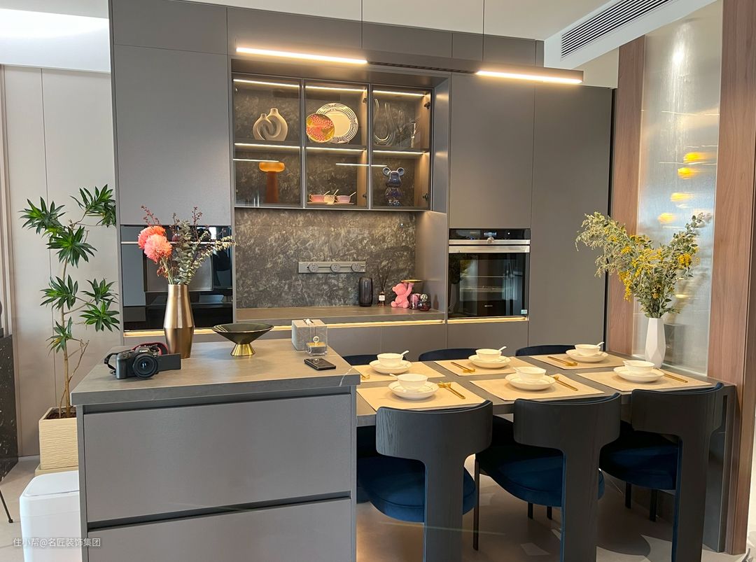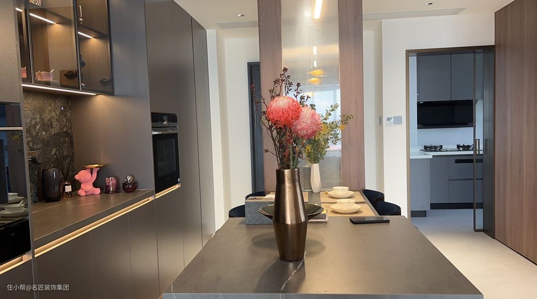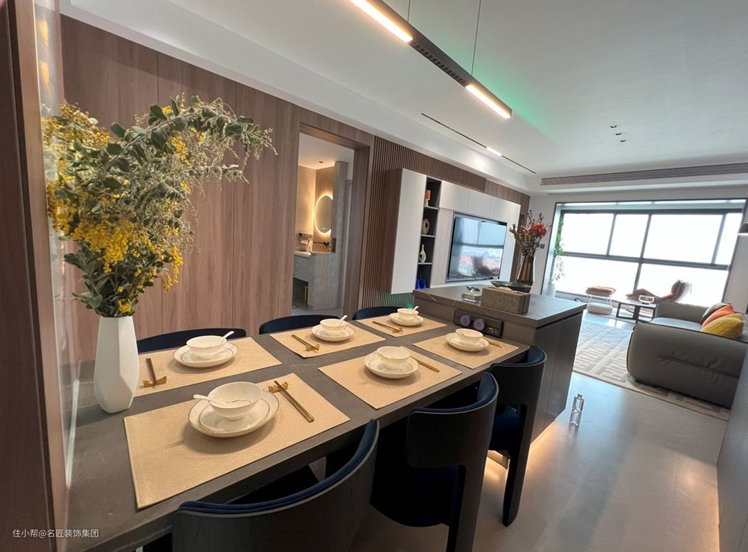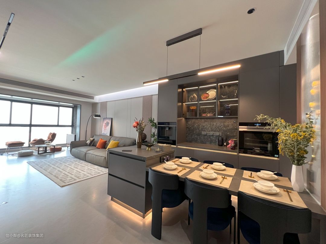 软装上选择了简洁而实用的家具,在色调上,选择灰色的餐桌搭配时尚现代的餐椅。以保持整体空间的和谐统一