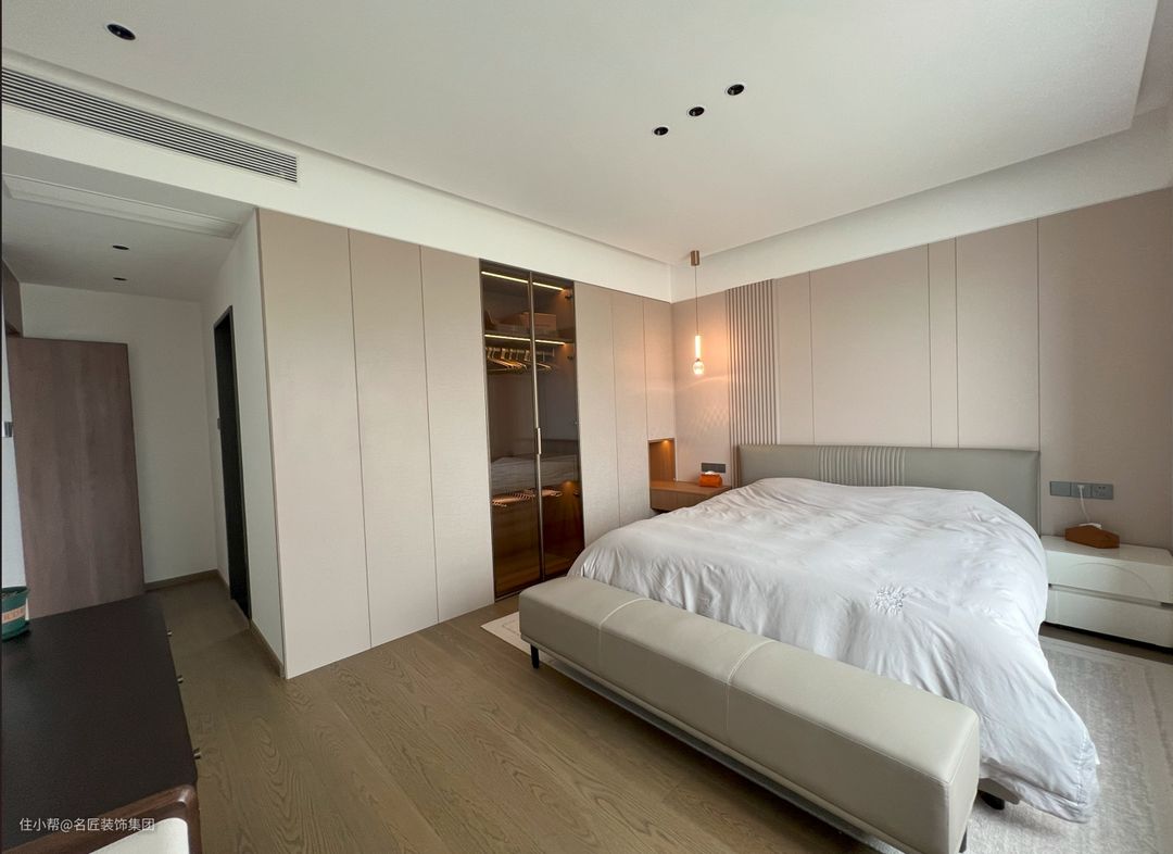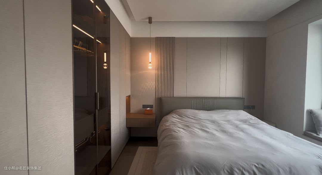 卧室的天花板采用悬浮吊顶,无主灯设计,并且选择暗藏灯带,营造出低调而高级的氛围。窗帘选用米白色,既保证了光线的充足,又不失优雅。定制衣柜则采用深咖色玻璃门与卡其色门拼色组合,展现出独特的设计感。床的背景墙则采用竹木纤维护墙板与碳金板相互穿插,既有自然的质感,又不失现代的线条感。