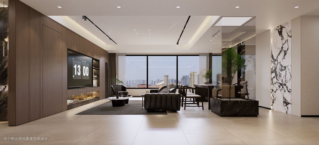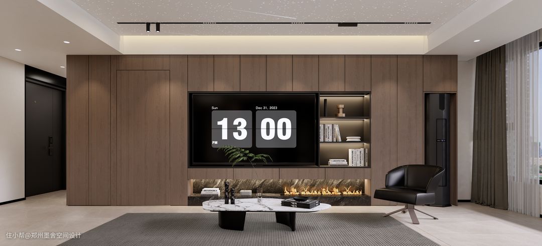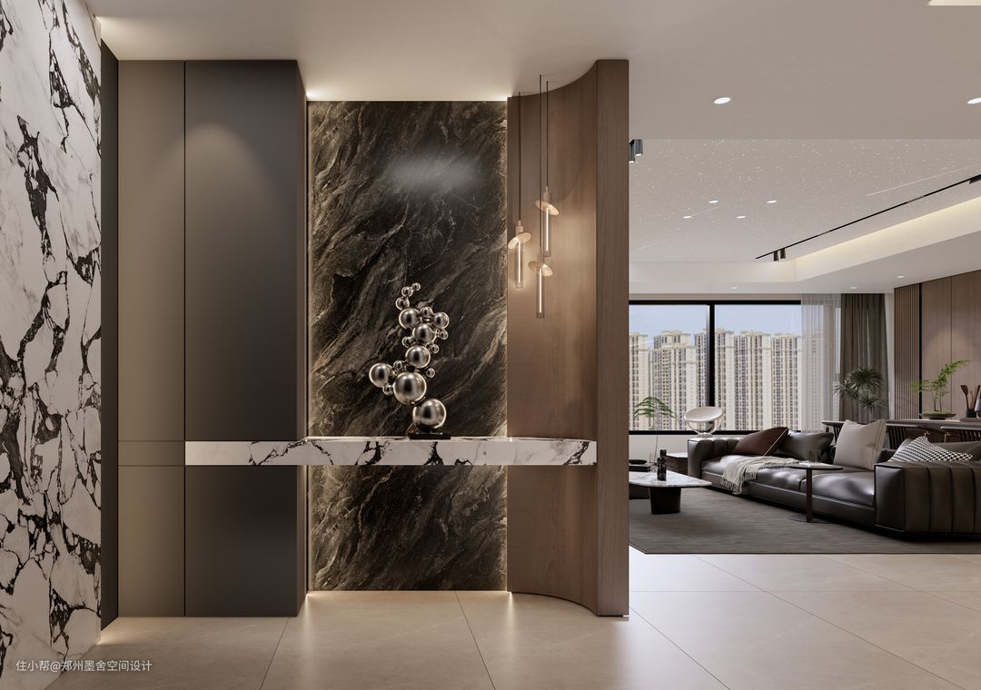 ■储物+展示背景墙,造型简洁,既满足了使用,又充满格调。电视背景墙下是大理石跳色,营造时尚又不失奢华的视觉效果。
