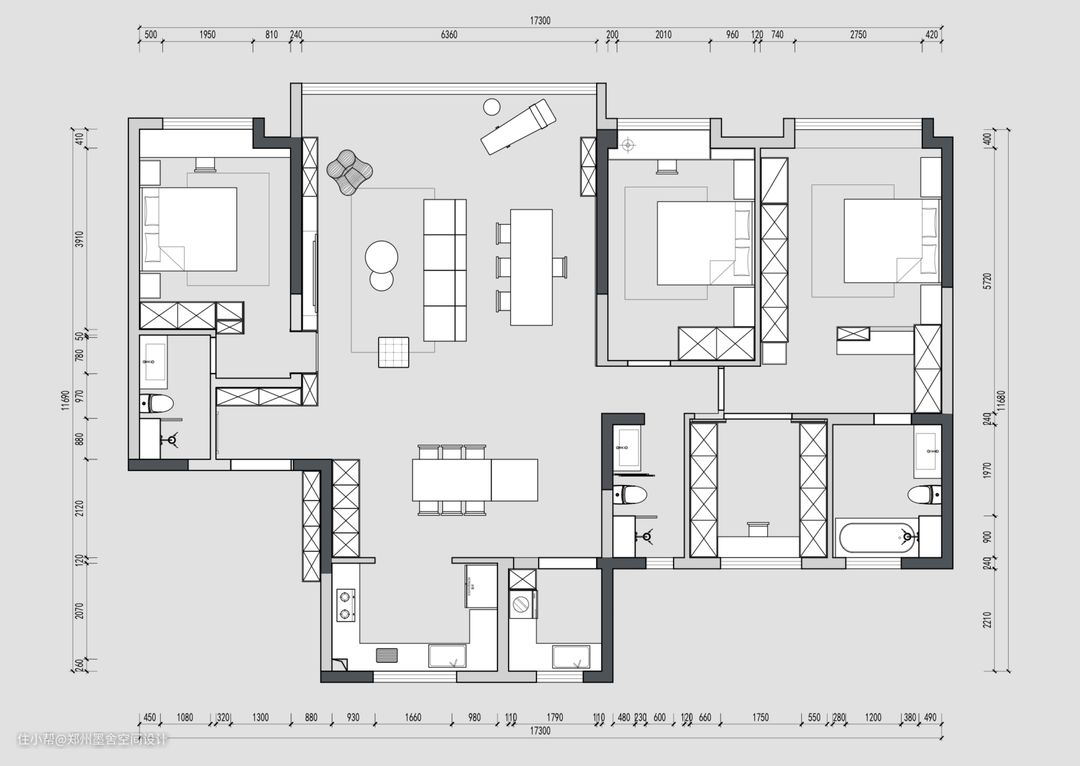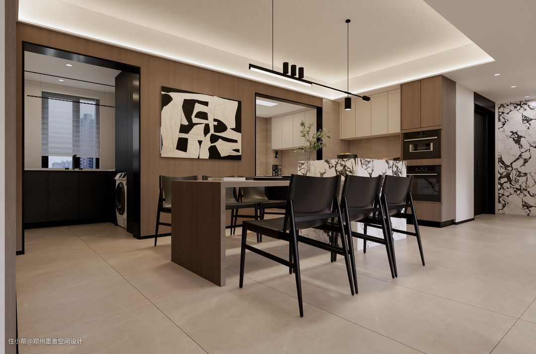装修诉求 家🖤 室内的储物空间要多,需要收纳很多的物品,喜欢意式风格,简约大气。客厅吊顶想要有星空顶 ,和无主灯设计。此外,餐厅局域需要满足六人用餐。还需要一个单独的家政间,和主卧室的衣帽间,客卫干湿分离。 装修前: ★户型分析优点: 1.通过平面看,房屋结构还是比较方正和实用的,可以满足大部分的业主需求 2.室内承重墙较少,户型可规划性强,根据业主的需求,调整室内布局 3.整个户型动线通畅,南北通透 ★户型分析缺点: 1.部分空间面积较为局促 2.卧室门洞在客厅空间中 装修后: ★装修亮点: 1.鸡肋飘窗改书桌,空间利用嘎嘎棒。将飘窗台整体向外延伸20公分,设计悬浮式书桌,底部空间宽敞方便放腿,使用起来更舒服 2.主卧镂空挂衣区太实用了。次日穿搭或常穿的单品都可以挂在这里,拿取方便 3.南北通透+客餐厅一体,意式大横厅设计,秒变大平层。整个吊顶采用了无主灯设计,客厅做了悬浮吊顶,搭配暖光灯带,满足空间照明的前提下让整个空间也显得特别温馨,局部加了射灯及轨道灯作为重点照明,满足整个空间的光源设计 4.餐桌+岛台一体化设计,可以最大化利用空间。强调就餐仪式感的同时,也将入户与客餐厅动线分为两个回字形。岩板岛台+原木餐桌,呼应了整个大空间的主题色调,极具设计感。 5.入户玄关运用线条几何分割的穿插手法,营造出整个空间的质感与品味,让原本的入户玄关,多了些现代潮流感,演绎出时尚简约的现代格调 6.电视墙连次卧“隐形门”一体设计,将门完全隐形于墙中,保持一面墙的整体性,让空间更显大,比起传统室内门,隐形门颜值高,存在感低,可以通过隐形门拉宽墙面
