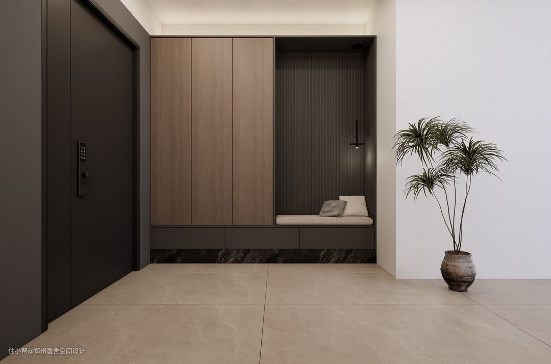 ■入户做玄关柜+换鞋凳一体,每天进出都很便捷。穿插式的玄关柜,黑色抽屉穿插咖色柜子,无把手反弹门设计,隐藏收纳又简约。下方镂空,放置常穿的鞋子,拿取方便。