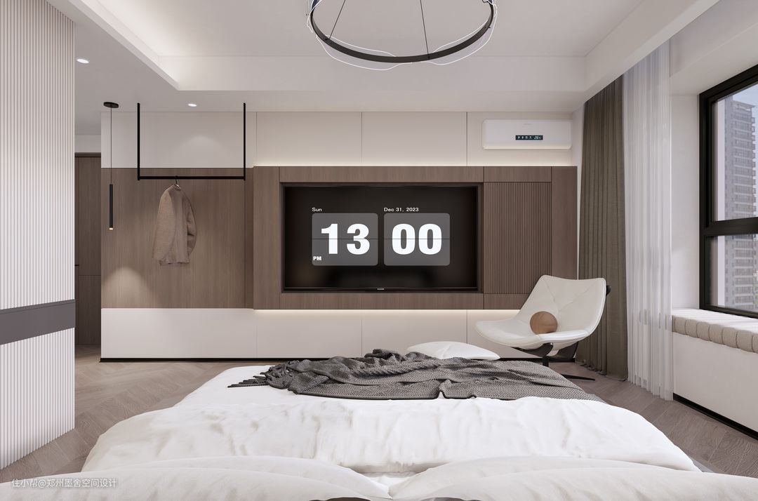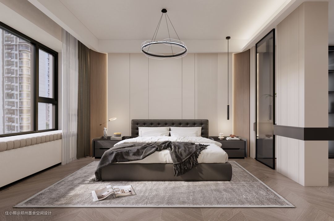 ■卧室墙和地面的色颜统一协调,墙面选择奶茶色调,给人以舒缓轻松的体验感,床头背景墙使用木饰面和低饱和度的护墙板拼色设计,配合灯带营造氛围感,搭配造型简单的落地式床,床头背景墙添加吊灯,打破单调感同时营造一定的艺术气息,简约而不简单。卧室衣柜做一门到顶不积灰还美观耐看 。