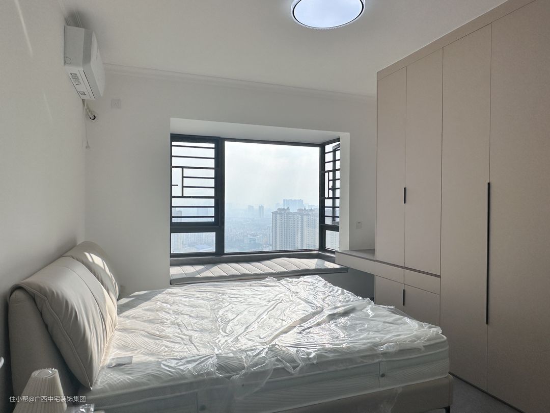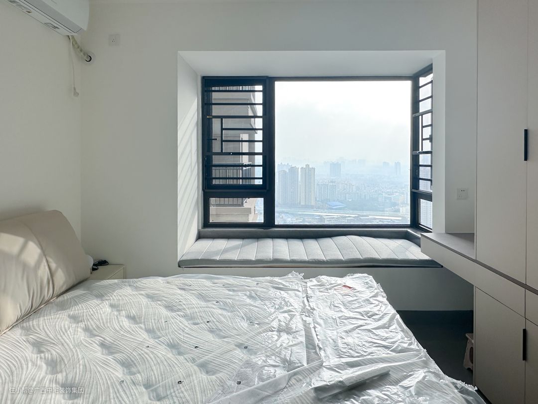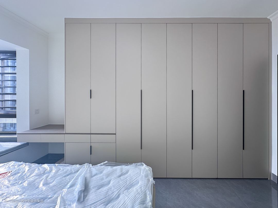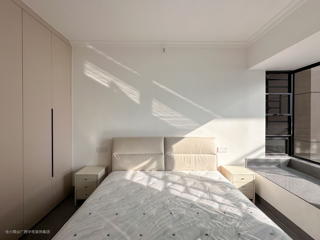 次卧以简洁的线条勾勒出优雅的轮廓,灰色的基调营造出沉稳的氛围,每一样元素都在默默讲述着从容与秩序的故事。入门处的衣柜,彰显收纳的智慧和品味。窗外,阳光洒落,为这个空间披上了一层金色的光晖。