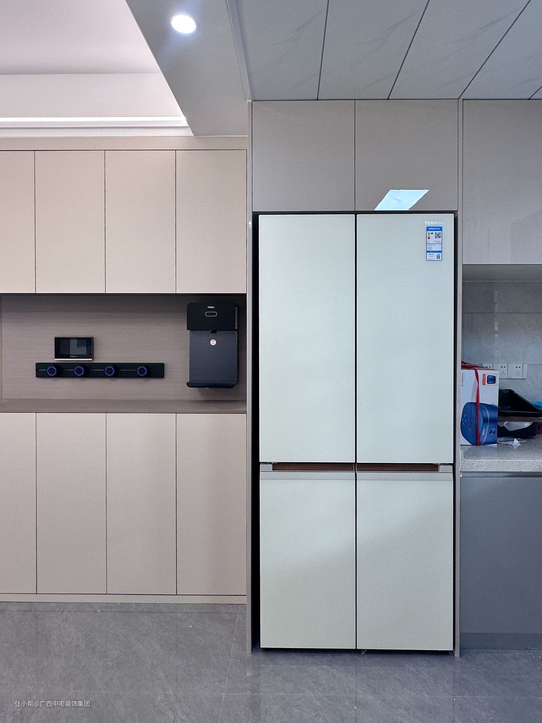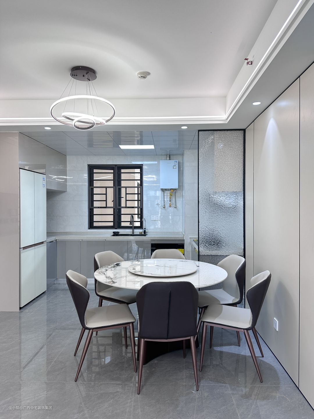 厨房开放式设计,演绎极致烹饪体验。嵌入式双开门冰箱,一体化到顶橱柜,无缝隙收纳,各种烹饪工具被有序安排在设计好的收纳空位上,整洁度井然有序。