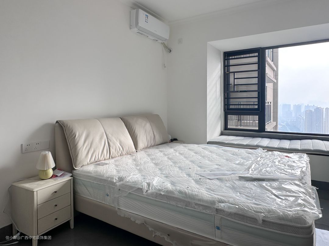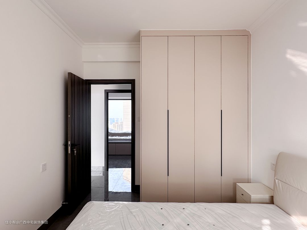 主卧的设计注重舒适与实用。一整面木质衣柜,完美收纳春夏秋冬四季衣物和棉被,柜延伸出来的书桌,给办公和学习提供了宽敞舒适的空间,旁边优雅舒适的床,是良好地睡眠保障。