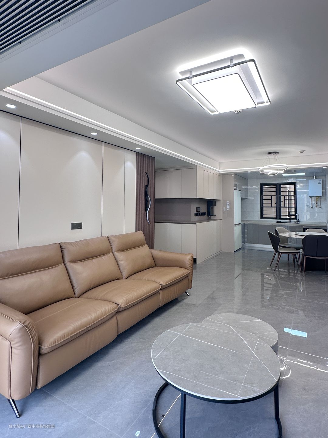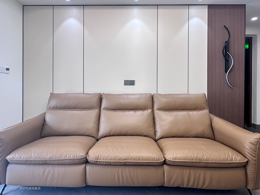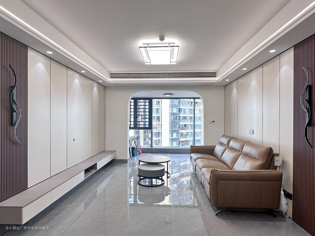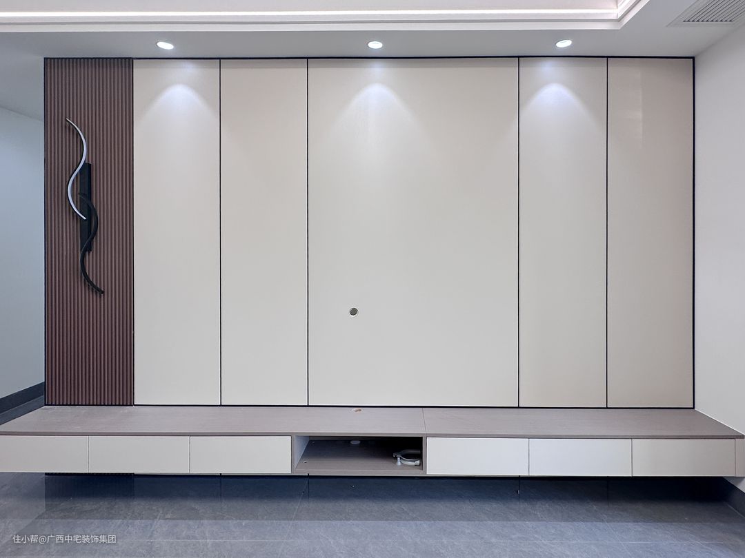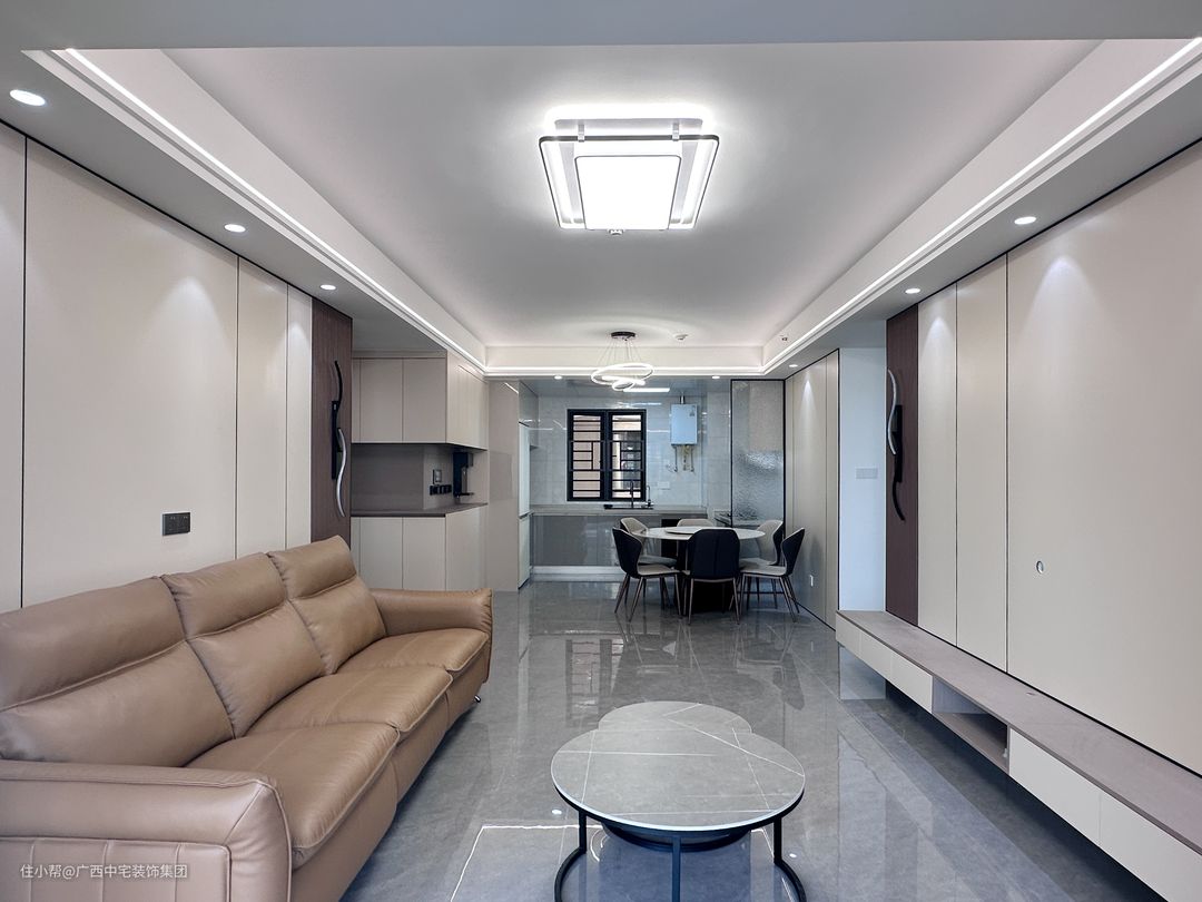 客厅以浅灰为主,简约装饰,暖意流转。直线空间动线联动,主灯与射灯协调一起点亮空间。双眼皮吊顶可以更好地拉升层高,美化空间。加上护墙板元素糅合,呈现更好的几何美感。