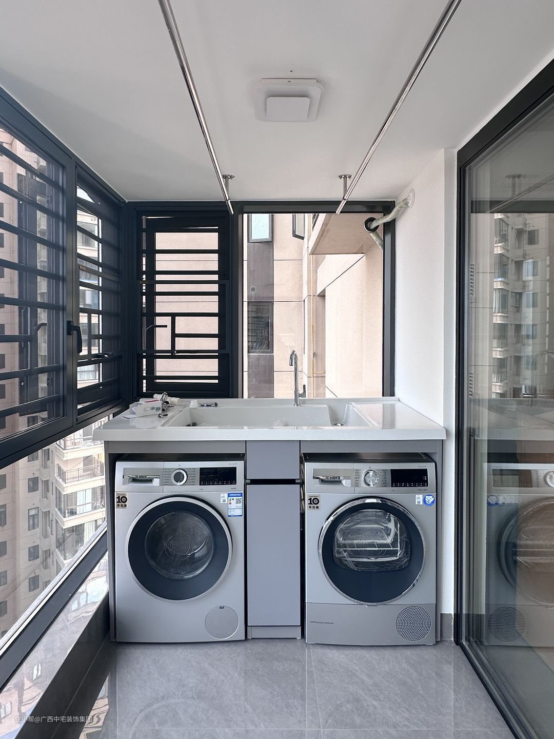 阳台的设计巧妙地融合了超大落地窗,让室内通风和采光效果达到好的效果。阳光透过玻璃洒入室内,增添了一份明亮与温暖。一侧洗衣柜将滚筒洗衣机完美嵌入,不仅美观实用,还成为阳台的一道亮丽风景线。