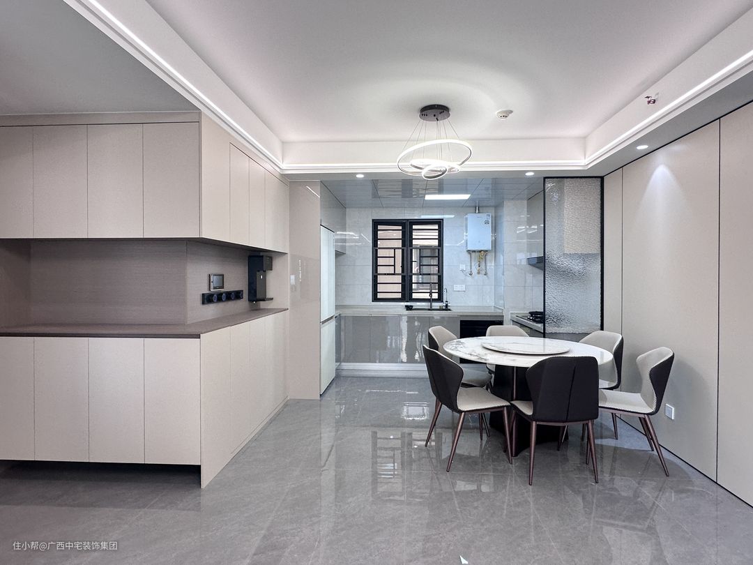 餐厅注重空间的开放性和流畅性,精心地动线设计让空间在光线上更加通透,为家人营造一个舒适的就餐环境。餐边柜拥有强大的收纳功能,可以收纳餐具和日常用品,保持空间整洁有序。六人位的圆形岩板餐桌,一家人围坐在餐桌前,品尝美食、畅谈生活,感受家庭的温暖和谐,一切都刚刚好。