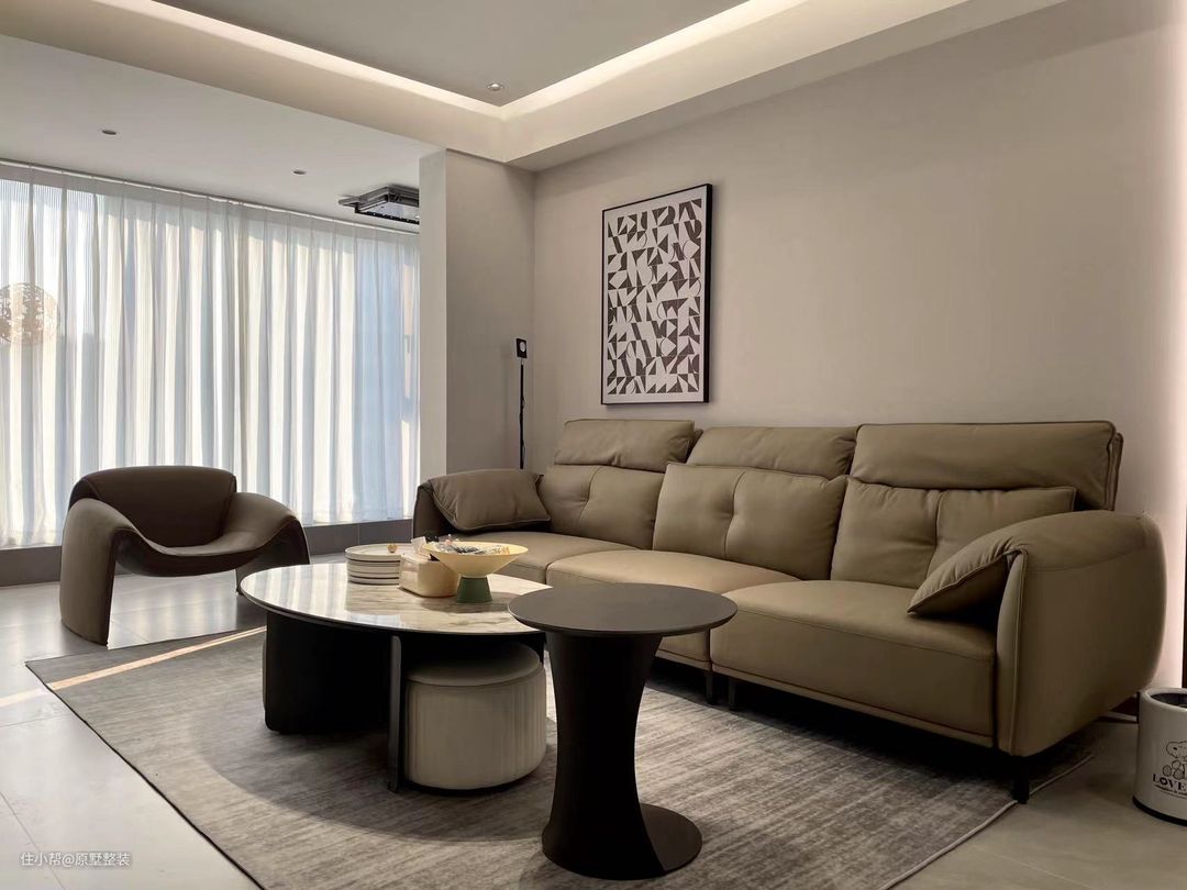 浅咖色的皮质沙发为客厅空间注入轻松舒适的感觉,搭配不规则茶几,高低组合、错落有致,提升空间层次感与丰富感! 无主灯设计搭配背景墙隐藏式灯带,增加空间层次氛围感,让人随心所欲、自由热情的生活!
