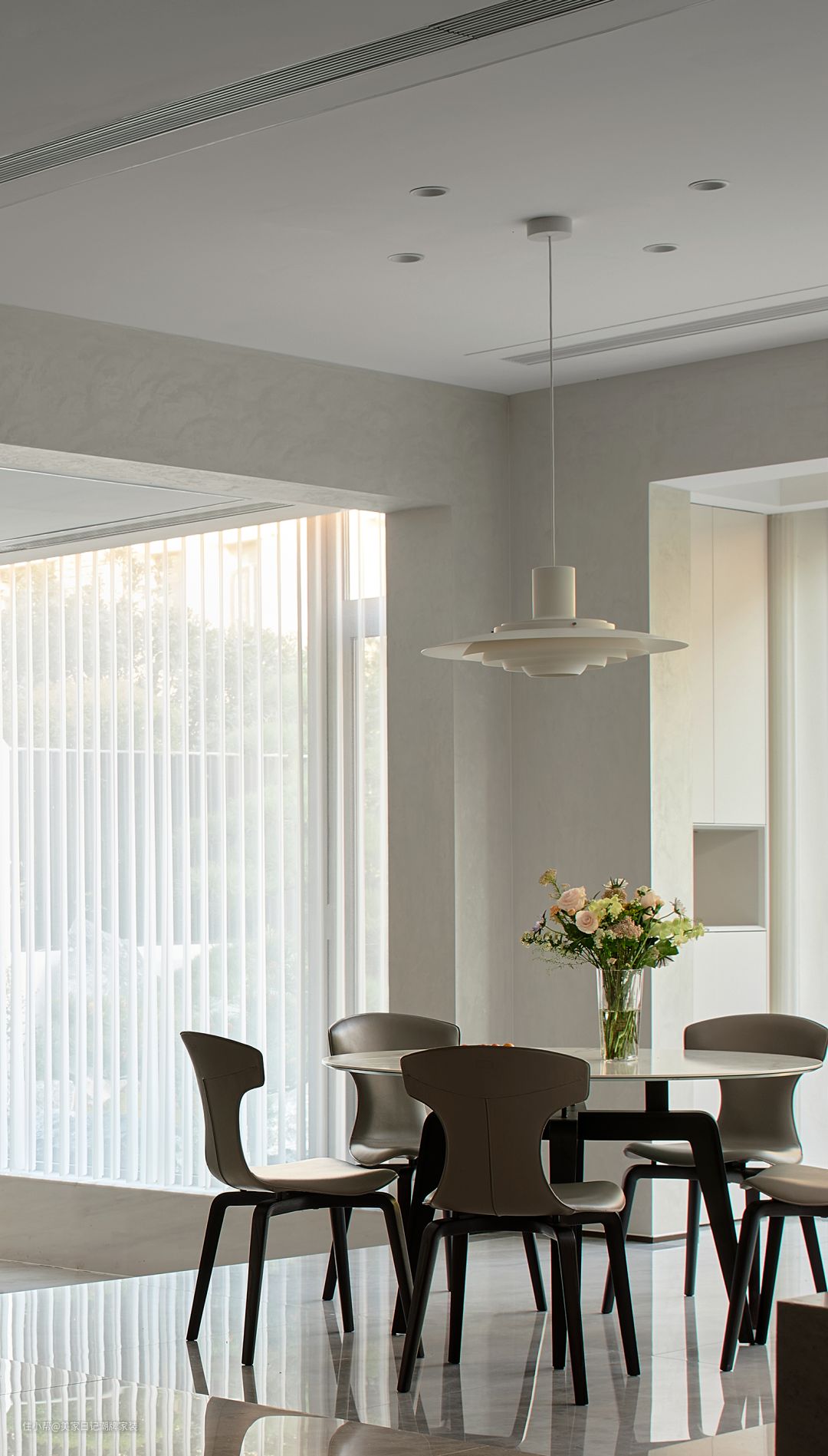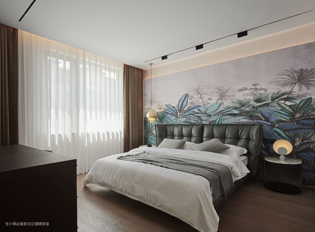 主卧墙壁印刻着植物主题插画,园林中的精华悉数行至卧室,化为生活的幕布。蓝色、紫色的叶片在浅灰色背景下沉静内敛,热情又安稳,无时无刻陪伴着居住者静享独处时光。