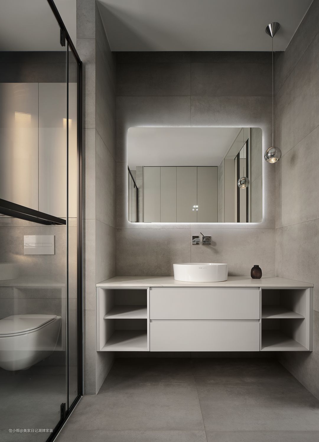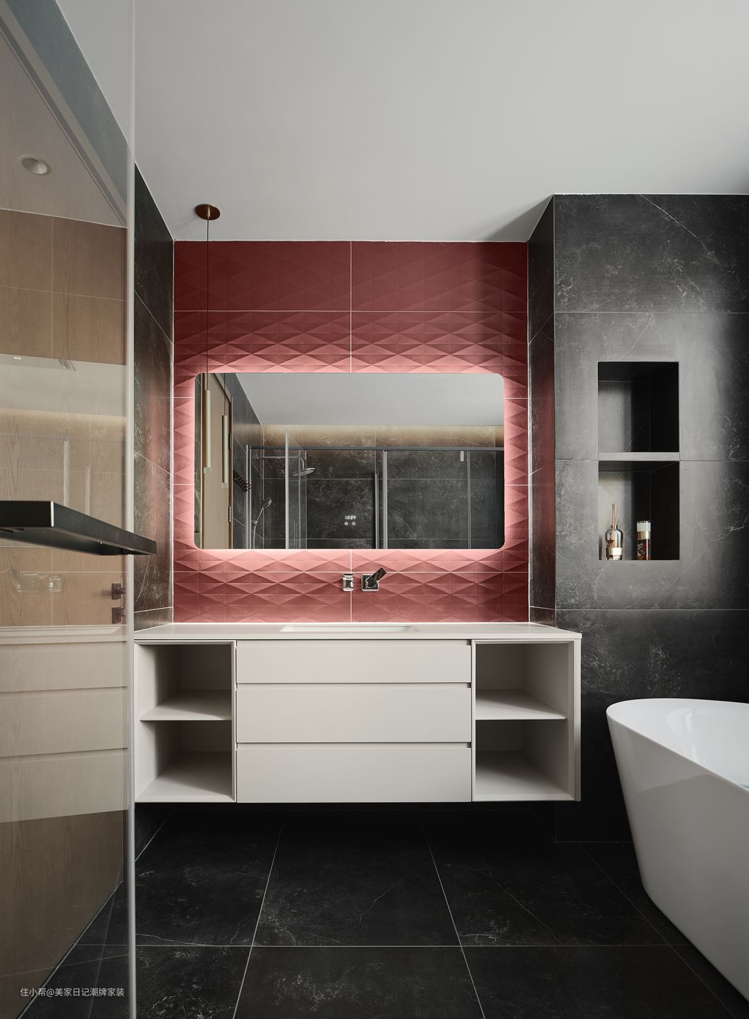浴室以极简风格为底蕴,在黑白之间加入红色菱形墙壁,中性深沉的空间在明暗对比下仿佛有了热情温和的“情感”,它吸引居住者重新审视,也随时欢迎居住者来到这里,把外界的烦忧抛诸脑后。