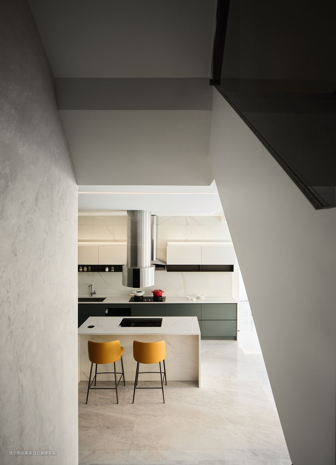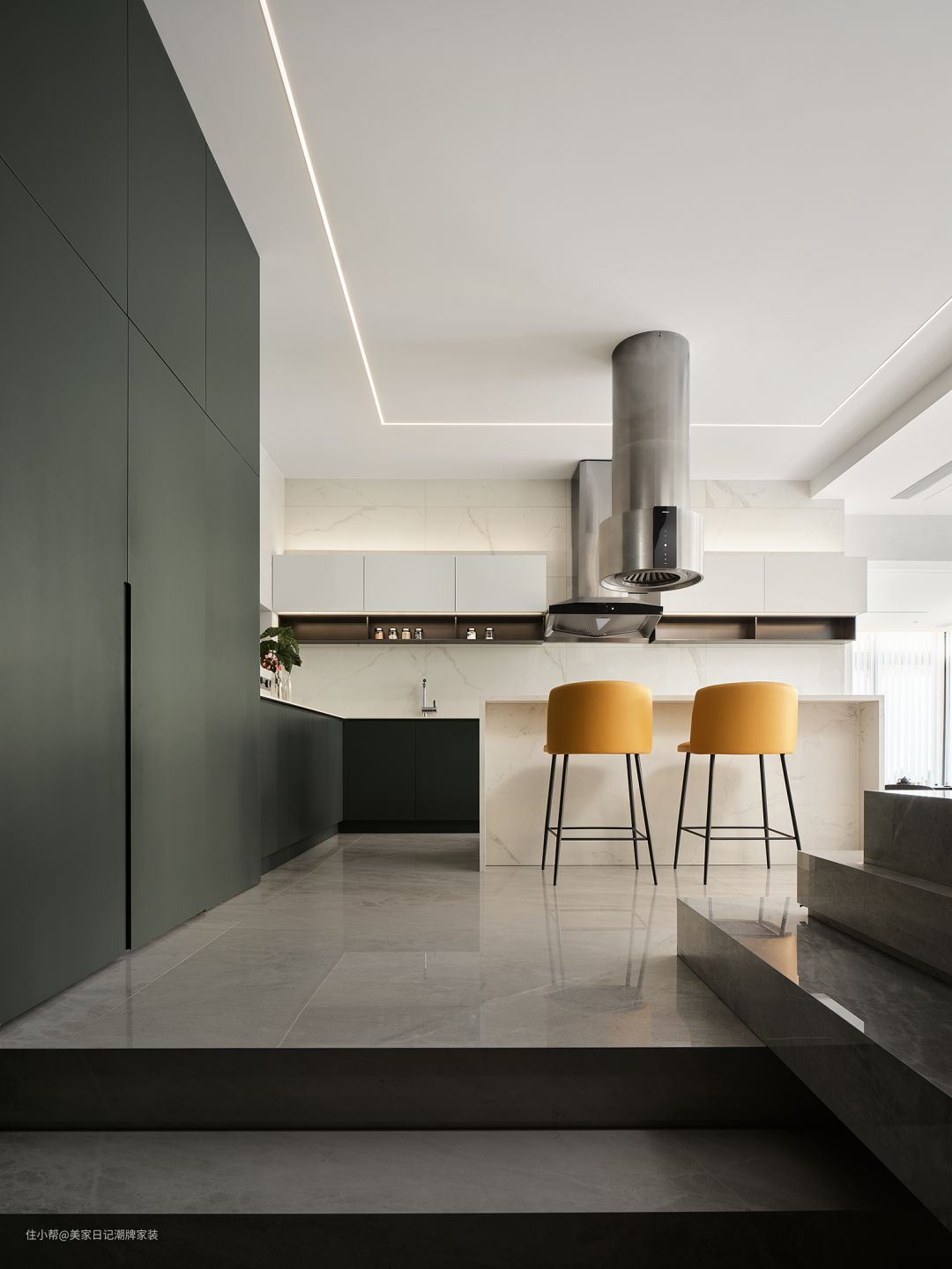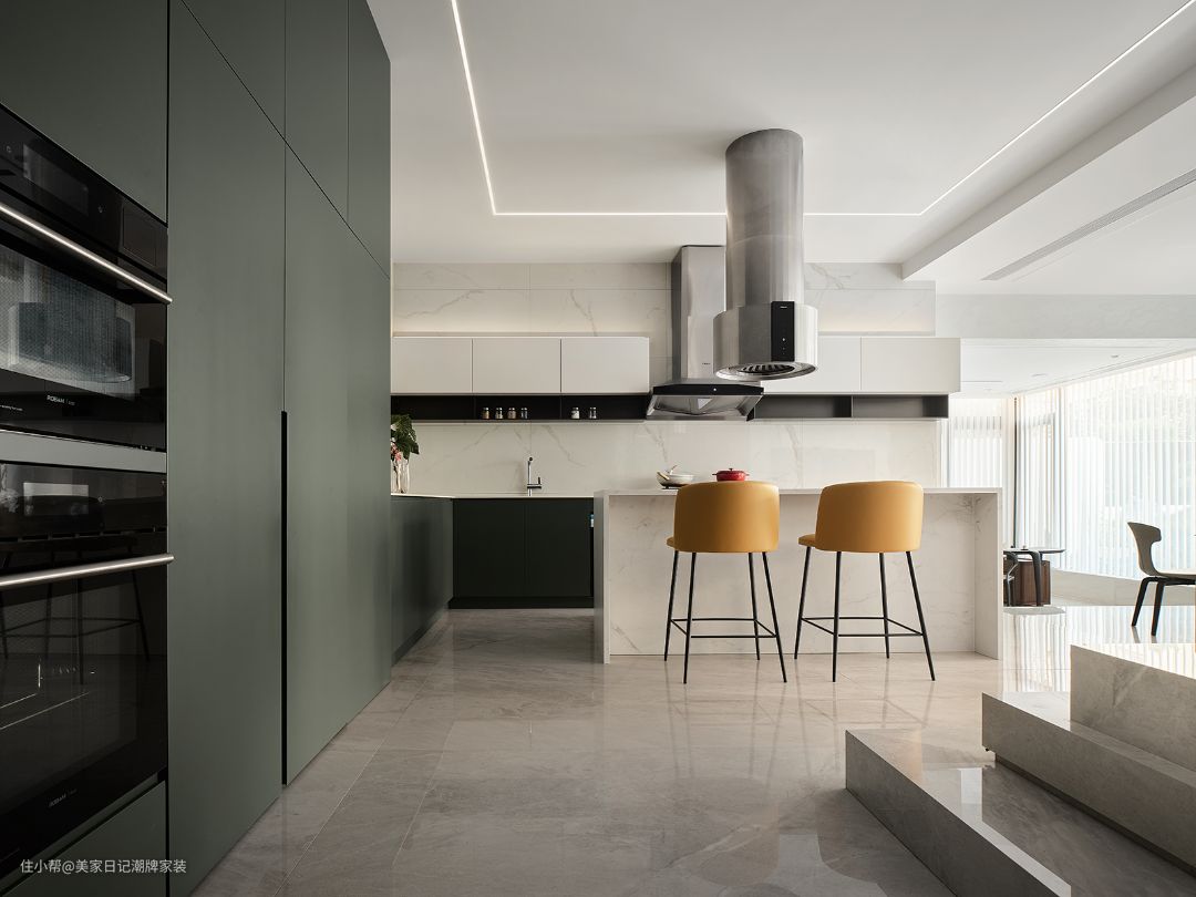 厨房处的黄色座椅与墨绿色墙面继而将阳光与林地带入家中。
