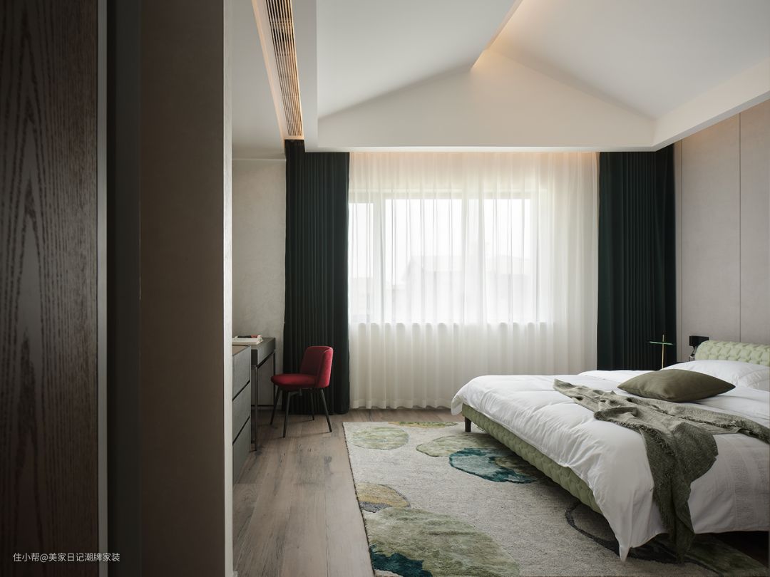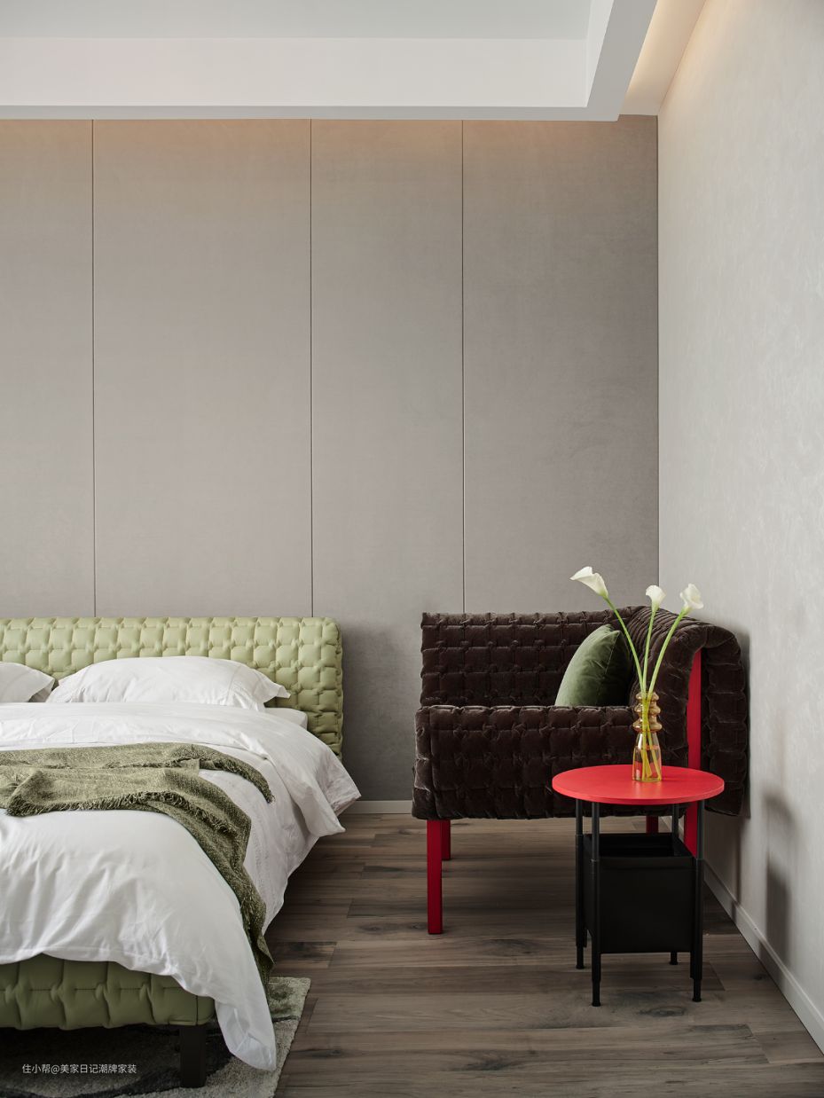 次卧将自然气息延续到底,草绿色从地毯蔓上床体,红棕相间的休息椅优雅高级,与质朴的自然新绿产生鲜明反差。