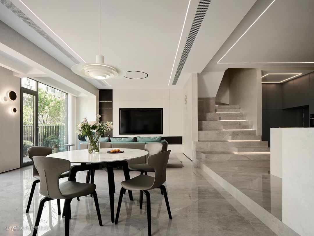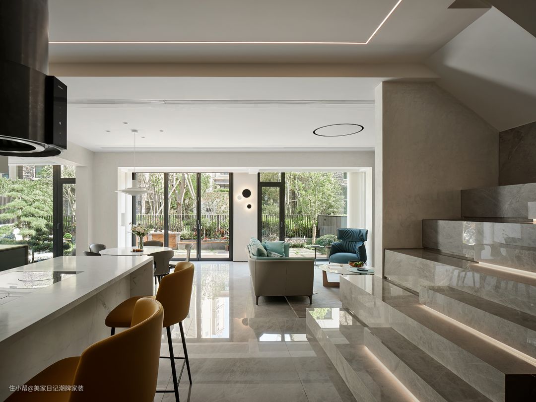 客厅中的深蓝色单人椅与湖绿色沙发象征着大海与湖水。